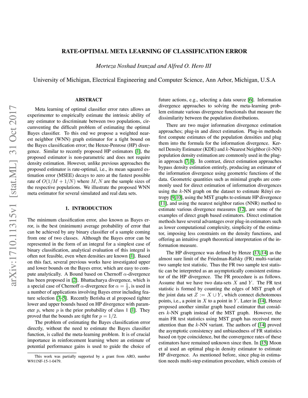Meta learning of optimal classifier error rates allows an experimenter to empirically estimate the intrinsic ability of any estimator to discriminate between two populations, circumventing the difficult problem of estimating the optimal Bayes classifier. To this end we propose a weighted nearest neighbor (WNN) graph estimator for a tight bound on the Bayes classification error; the Henze-Penrose (HP) divergence. Similar to recently proposed HP estimators [berisha2016], the proposed estimator is non-parametric and does not require density estimation. However, unlike previous approaches the proposed estimator is rate-optimal, i.e., its mean squared estimation error (MSEE) decays to zero at the fastest possible rate of where are the sample sizes of the respective populations. We illustrate the proposed WNN meta estimator for several simulated and real data sets.