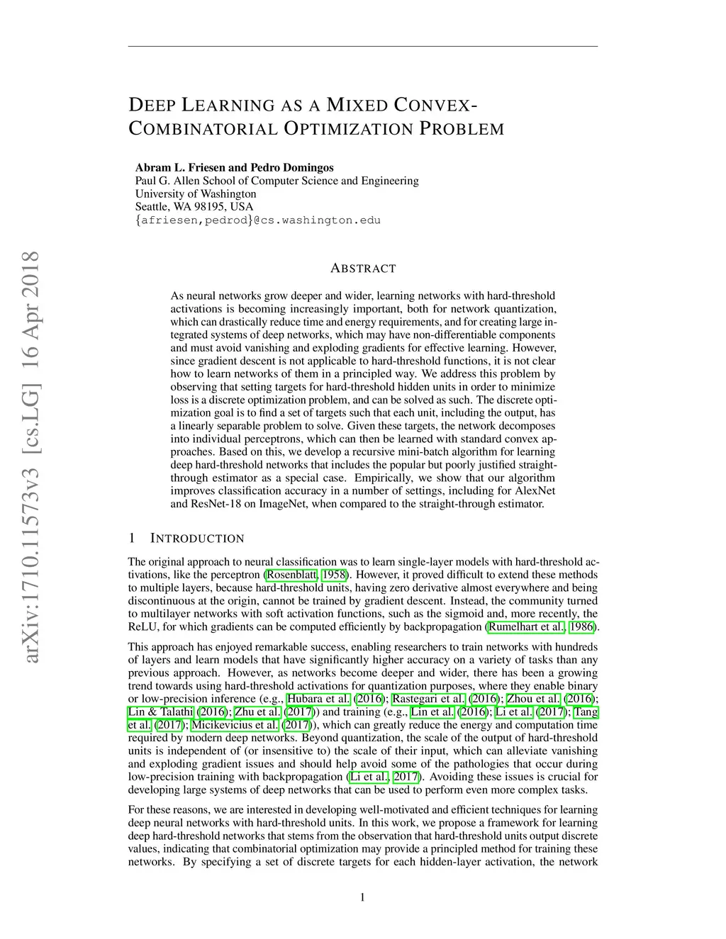 As neural networks grow deeper and wider, learning networks with hard-threshold activations is becoming increasingly important, both for network quantization, which can drastically reduce time and energy requirements, and for creating large integrated systems of deep networks, which may have non-differentiable components and must avoid vanishing and exploding gradients for effective learning. However, since gradient descent is not applicable to hard-threshold functions, it is not clear how to learn networks of them in a principled way. We address this problem by observing that setting targets for hard-threshold hidden units in order to minimize loss is a discrete optimization problem, and can be solved as such. The discrete optimization goal is to find a set of targets such that each unit, including the output, has a linearly separable problem to solve. Given these targets, the network decomposes into individual perceptrons, which can then be learned with standard convex approaches. Based on this, we develop a recursive mini-batch algorithm for learning deep hard-threshold networks that includes the popular but poorly justified straight-through estimator as a special case. Empirically, we show that our algorithm improves classification accuracy in a number of settings, including for AlexNet and ResNet-18 on ImageNet, when compared to the straight-through estimator.