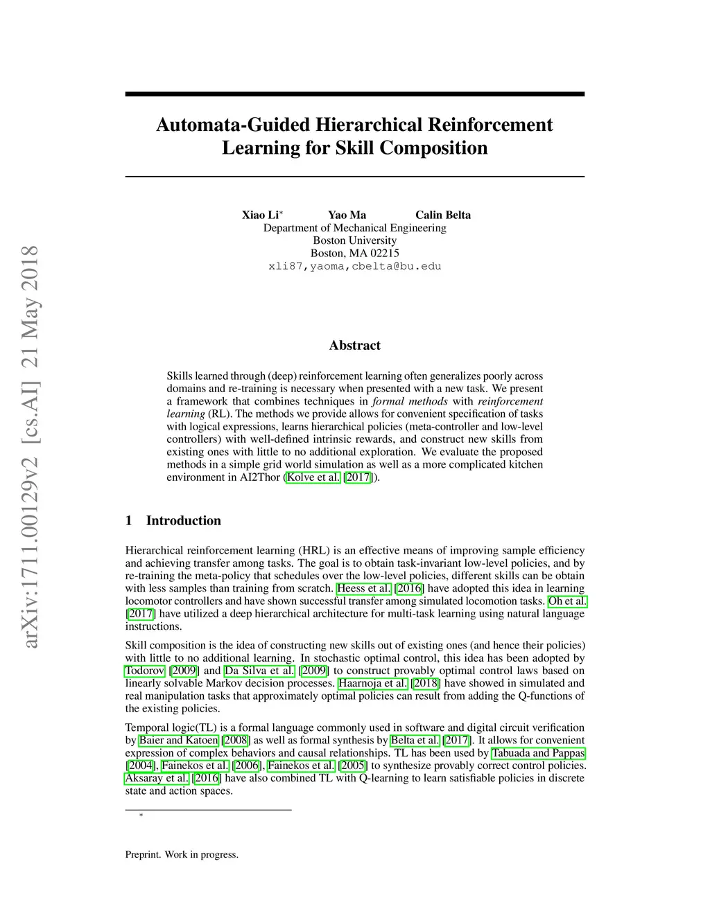 Skills learned through (deep) reinforcement learning often generalizes poorly across domains and re-training is necessary when presented with a new task. We present a framework that combines techniques in \textit{formal methods} with \textit{reinforcement learning} (RL). The methods we provide allows for convenient specification of tasks with logical expressions, learns hierarchical policies (meta-controller and low-level controllers) with well-defined intrinsic rewards, and construct new skills from existing ones with little to no additional exploration. We evaluate the proposed methods in a simple grid world simulation as well as a more complicated kitchen environment in AI2Thor