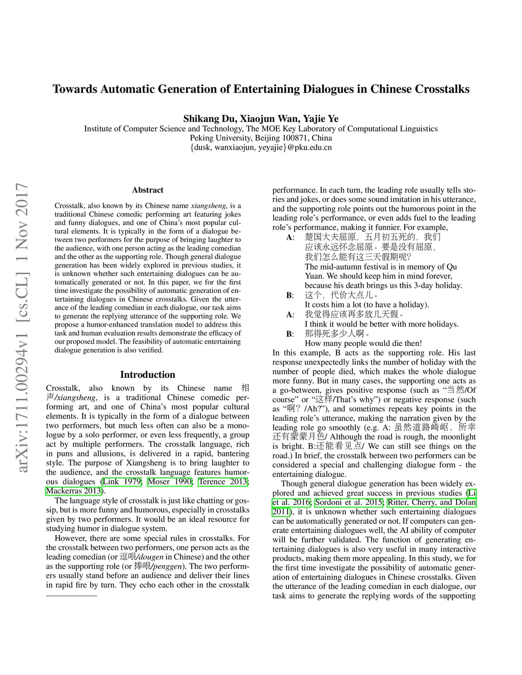 Towards Automatic Generation of Entertaining Dialogues in Chinese