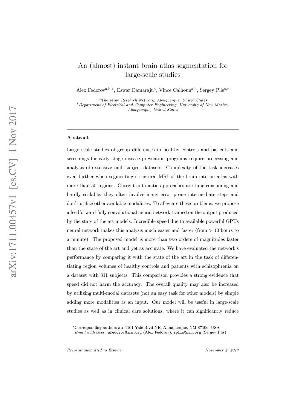Large scale studies of group differences in healthy controls and patients and screenings for early stage disease prevention programs require processing and analysis of extensive multisubject datasets. Complexity of the task increases even further when segmenting structural MRI of the brain into an atlas with more than 50 regions. Current automatic approaches are time-consuming and hardly scalable; they often involve many error prone intermediate steps and don't utilize other available modalities. To alleviate these problems, we propose a feedforward fully convolutional neural network trained on the output produced by the state of the art models. Incredible speed due to available powerful GPUs neural network makes this analysis much easier and faster (from hours to a minute). The proposed model is more than two orders of magnitudes faster than the state of the art and yet as accurate. We have evaluated the network's performance by comparing it with the state of the art in the task of differentiating region volumes of healthy controls and patients with schizophrenia on a dataset with 311 subjects. This comparison provides a strong evidence that speed did not harm the accuracy. The overall quality may also be increased by utilizing multi-modal datasets (not an easy task for other models) by simple adding more modalities as an input. Our model will be useful in large-scale studies as well as in clinical care solutions, where it can significantly reduce delay between the patient screening and the result.
