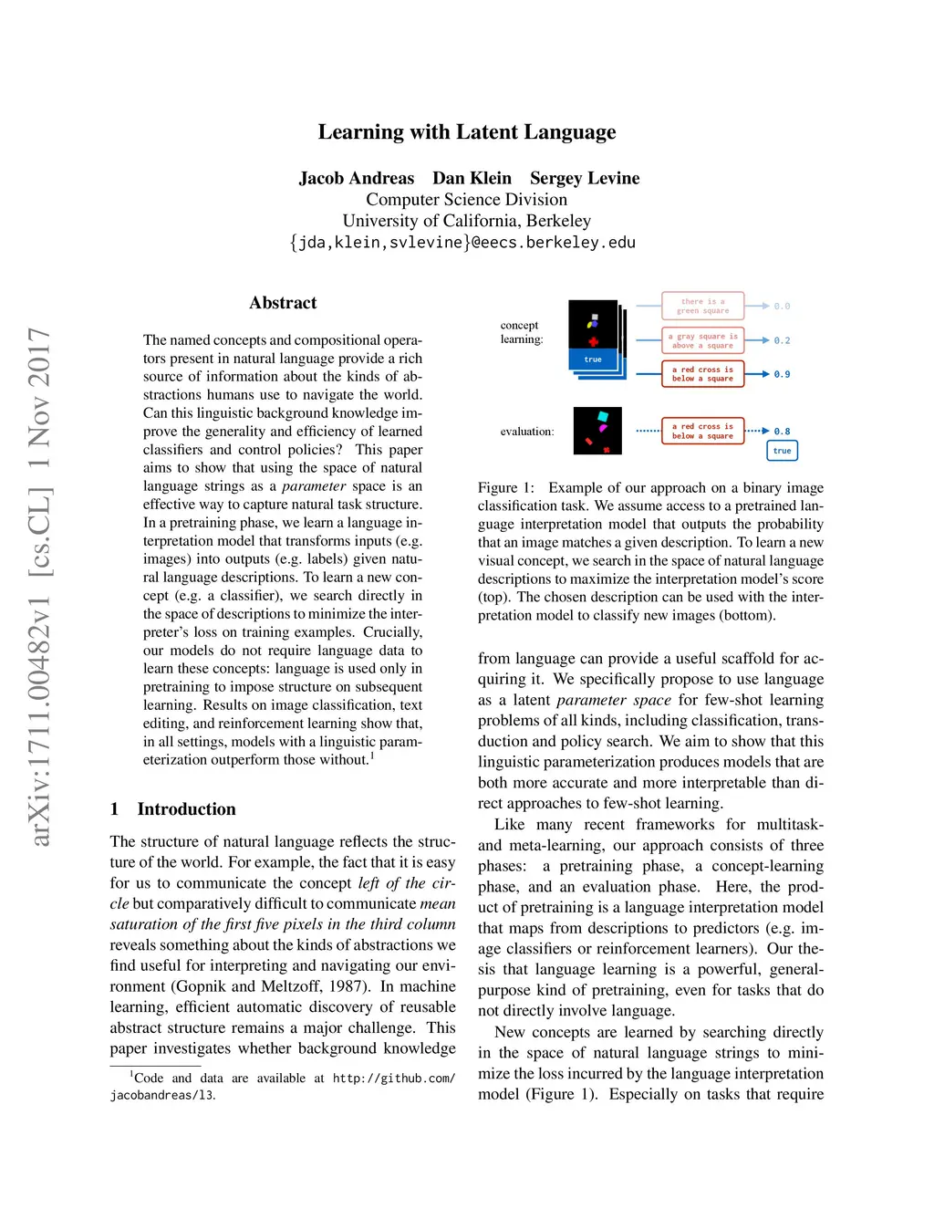 The named concepts and compositional operators present in natural language provide a rich source of information about the kinds of abstractions humans use to navigate the world. Can this linguistic background knowledge improve the generality and efficiency of learned classifiers and control policies? This paper aims to show that using the space of natural language strings as a parameter space is an effective way to capture natural task structure. In a pretraining phase, we learn a language interpretation model that transforms inputs (e.g. images) into outputs (e.g. labels) given natural language descriptions. To learn a new concept (e.g. a classifier), we search directly in the space of descriptions to minimize the interpreter's loss on training examples. Crucially, our models do not require language data to learn these concepts: language is used only in pretraining to impose structure on subsequent learning. Results on image classification, text editing, and reinforcement learning show that, in all settings, models with a linguistic parameterization outperform those without.
