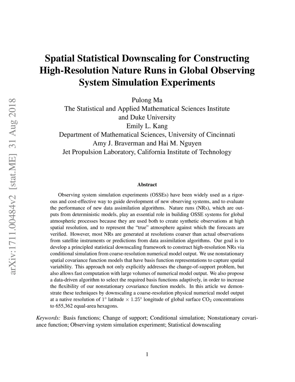 Observing system simulation experiments (OSSEs) have been widely used as a rigorous and cost-effective way to guide development of new observing systems, and to evaluate the performance of new data assimilation algorithms. Nature runs (NRs), which are outputs from deterministic models, play an essential role in building OSSE systems for global atmospheric processes because they are used both to create synthetic observations at high spatial resolution, and to represent the "true" atmosphere against which the forecasts are verified. However, most NRs are generated at resolutions coarser than actual observations. Here, we propose a principled statistical downscaling framework to construct high-resolution NRs via conditional simulation from coarse-resolution numerical model output. We use nonstationary spatial covariance function models that have basis function representations. This approach not only explicitly addresses the change-of-support problem, but also allows fast computation with large volumes of numerical model output. We also propose a data-driven algorithm to select the required basis functions adaptively, in order to increase the flexibility of our nonstationary covariance function models. In this article we demonstrate these techniques by downscaling a coarse-resolution physical NR at a native resolution of of global surface concentrations to 655,362 equal-area hexagons.