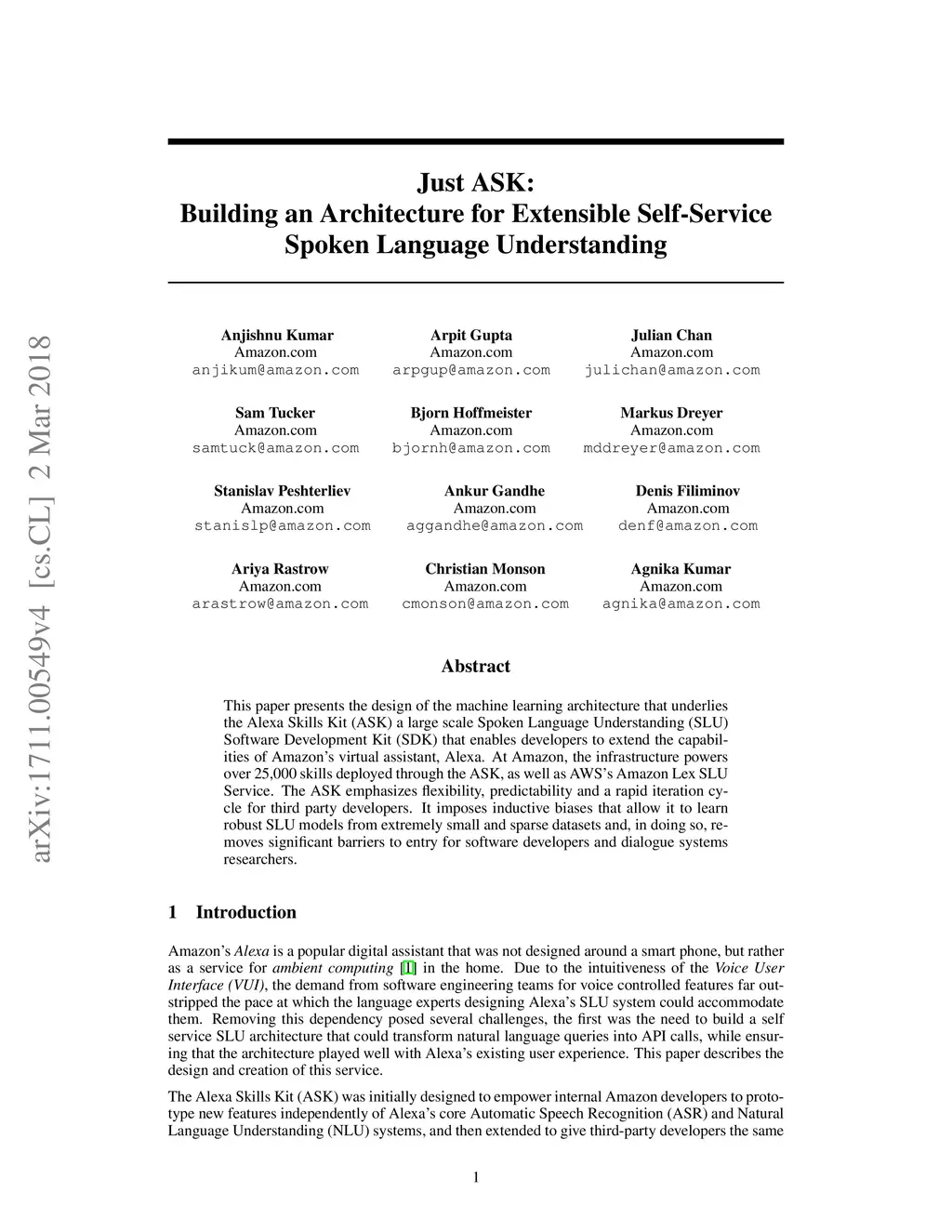 This paper presents the design of the machine learning architecture that underlies the Alexa Skills Kit (ASK) a large scale Spoken Language Understanding (SLU) Software Development Kit (SDK) that enables developers to extend the capabilities of Amazon's virtual assistant, Alexa. At Amazon, the infrastructure powers over 25,000 skills deployed through the ASK, as well as AWS's Amazon Lex SLU Service. The ASK emphasizes flexibility, predictability and a rapid iteration cycle for third party developers. It imposes inductive biases that allow it to learn robust SLU models from extremely small and sparse datasets and, in doing so, removes significant barriers to entry for software developers and dialogue systems researchers.