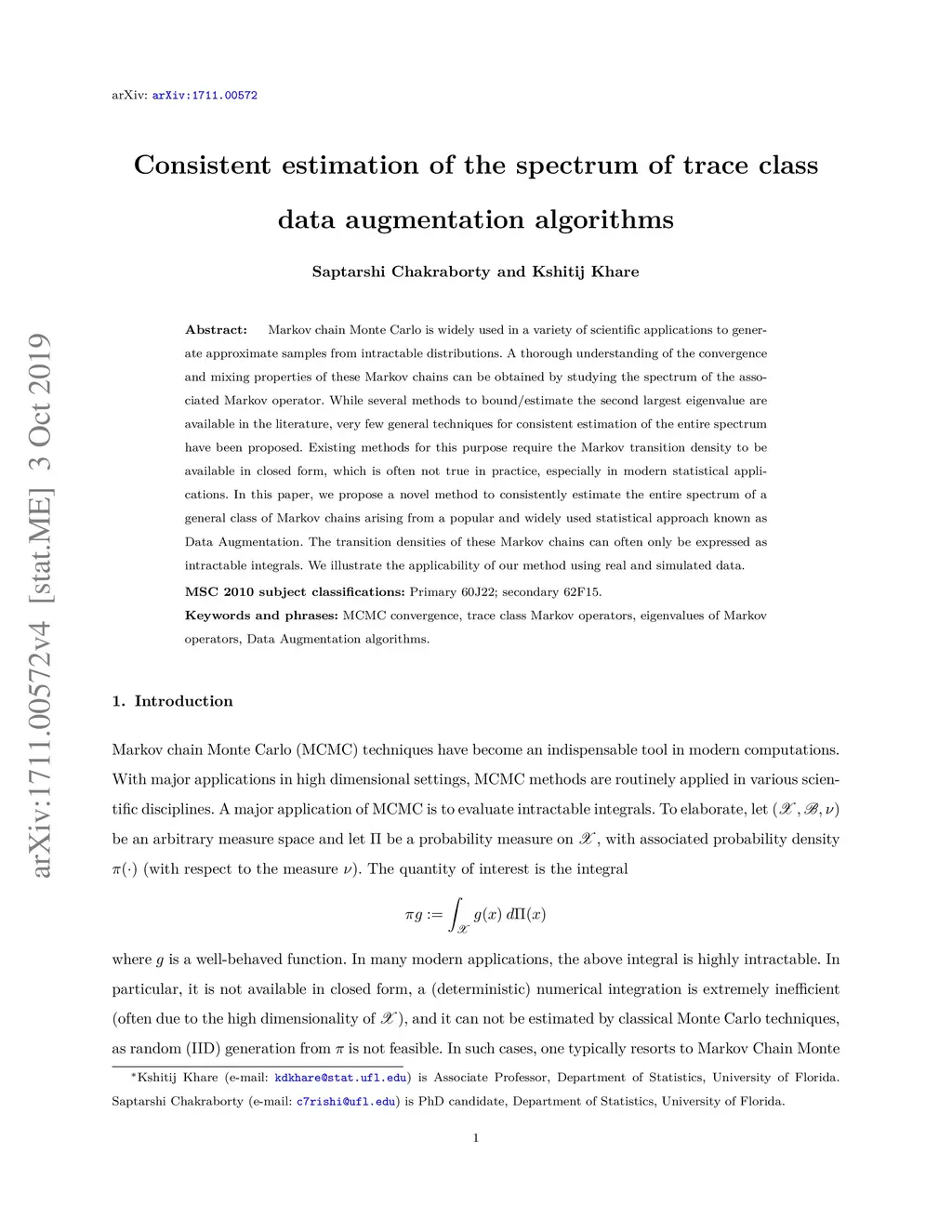Markov chain Monte Carlo is widely used in a variety of scientific applications to generate approximate samples from intractable distributions. A thorough understanding of the convergence and mixing properties of these Markov chains can be obtained by studying the spectrum of the associated Markov operator. While several methods to bound/estimate the second largest eigenvalue are available in the literature, very few general techniques for consistent estimation of the entire spectrum have been proposed. Existing methods for this purpose require the Markov transition density to be available in closed form, which is often not true in practice, especially in modern statistical applications. In this paper, we propose a novel method to consistently estimate the entire spectrum of a general class of Markov chains arising from a popular and widely used statistical approach known as Data Augmentation. The transition densities of these Markov chains can often only be expressed as intractable integrals. We illustrate the applicability of our method using real and simulated data.