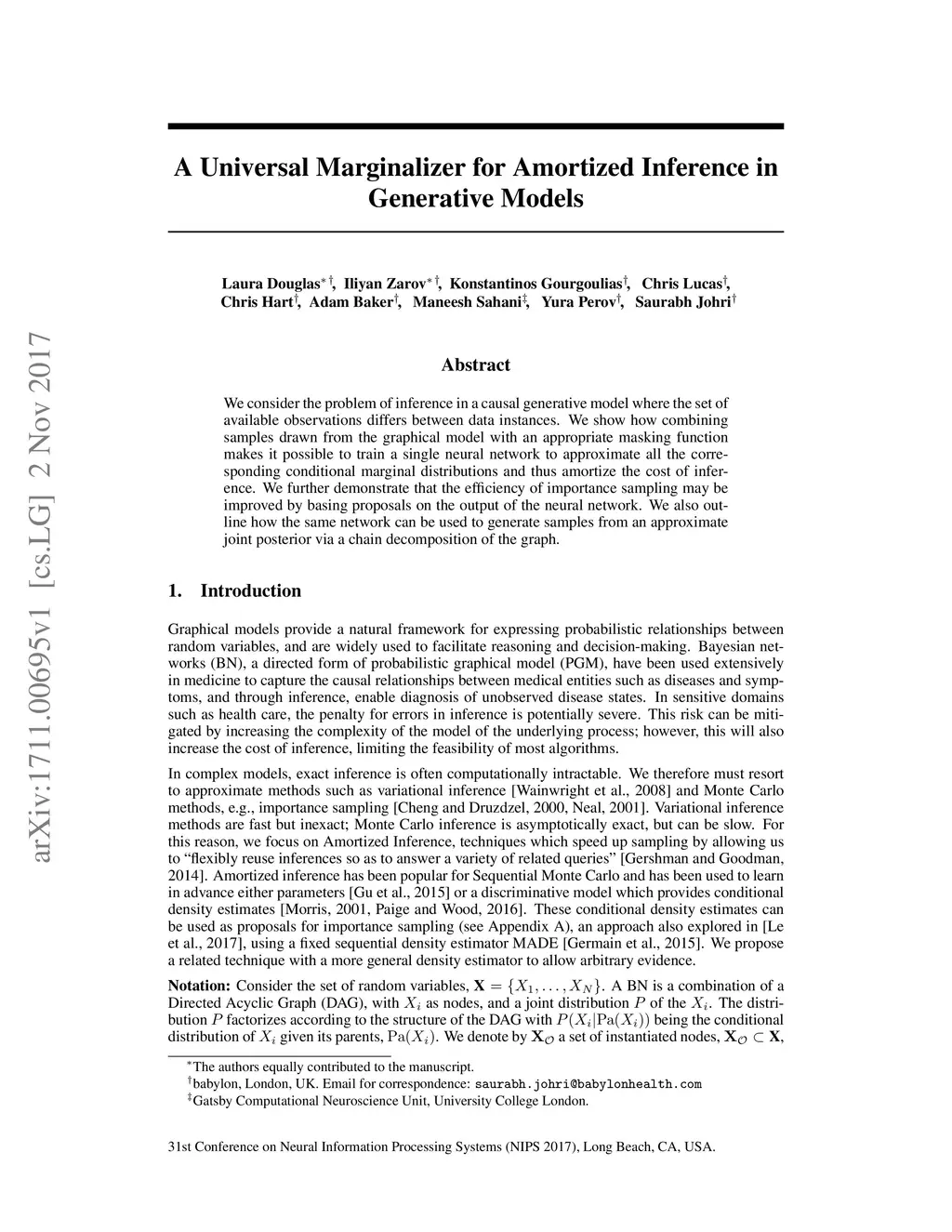 We consider the problem of inference in a causal generative model where the set of available observations differs between data instances. We show how combining samples drawn from the graphical model with an appropriate masking function makes it possible to train a single neural network to approximate all the corresponding conditional marginal distributions and thus amortize the cost of inference. We further demonstrate that the efficiency of importance sampling may be improved by basing proposals on the output of the neural network. We also outline how the same network can be used to generate samples from an approximate joint posterior via a chain decomposition of the graph.