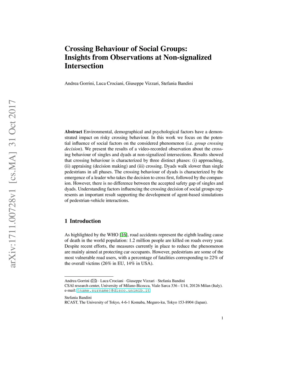 Environmental, demographical and psychological factors have a demonstrated impact on risky crossing behaviour. In this work we focus on the potential influence of social factors on the considered phenomenon (i.e. group crossing decision). We present the results of a video-recorded observation about the crossing behaviour of singles and dyads at non-signalized intersections. Results showed that crossing behaviour is characterized by three distinct phases: (i) approaching, (ii) appraising (decision making) and (iii) crossing. Dyads walk slower than single pedestrians in all phases. The crossing behaviour of dyads is characterized by the emergence of a leader who takes the decision to cross first, followed by the companion. However, there is no difference between the accepted safety gap of singles and dyads. Understanding factors influencing the crossing decision of social groups represents an important result supporting the development of agent-based simulations of pedestrian-vehicle interactions.