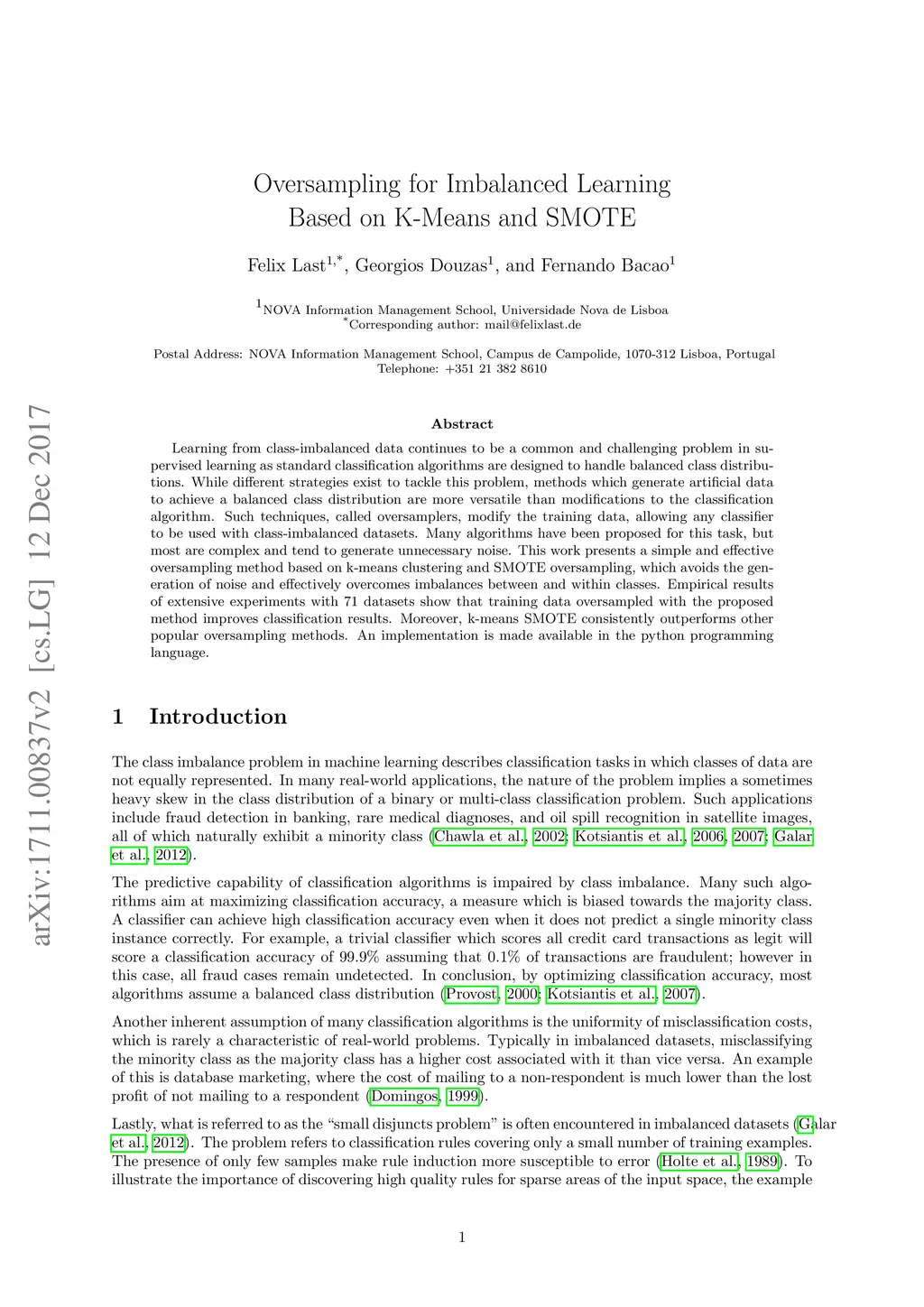 Learning from class-imbalanced data continues to be a common and challenging problem in supervised learning as standard classification algorithms are designed to handle balanced class distributions. While different strategies exist to tackle this problem, methods which generate artificial data to achieve a balanced class distribution are more versatile than modifications to the classification algorithm. Such techniques, called oversamplers, modify the training data, allowing any classifier to be used with class-imbalanced datasets. Many algorithms have been proposed for this task, but most are complex and tend to generate unnecessary noise. This work presents a simple and effective oversampling method based on k-means clustering and SMOTE oversampling, which avoids the generation of noise and effectively overcomes imbalances between and within classes. Empirical results of extensive experiments with 71 datasets show that training data oversampled with the proposed method improves classification results. Moreover, k-means SMOTE consistently outperforms other popular oversampling methods. An implementation is made available in the python programming language.