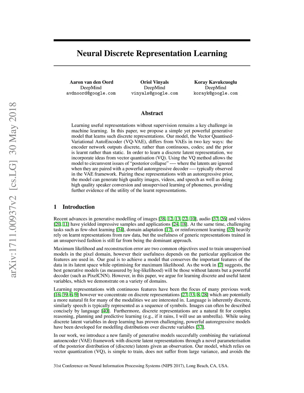 Learning useful representations without supervision remains a key challenge in machine learning. In this paper, we propose a simple yet powerful generative model that learns such discrete representations. Our model, the Vector Quantised-Variational AutoEncoder (VQ-VAE), differs from VAEs in two key ways: the encoder network outputs discrete, rather than continuous, codes; and the prior is learnt rather than static. In order to learn a discrete latent representation, we incorporate ideas from vector quantisation (VQ). Using the VQ method allows the model to circumvent issues of "posterior collapse" -- where the latents are ignored when they are paired with a powerful autoregressive decoder -- typically observed in the VAE framework. Pairing these representations with an autoregressive prior, the model can generate high quality images, videos, and speech as well as doing high quality speaker conversion and unsupervised learning of phonemes, providing further evidence of the utility of the learnt representations.