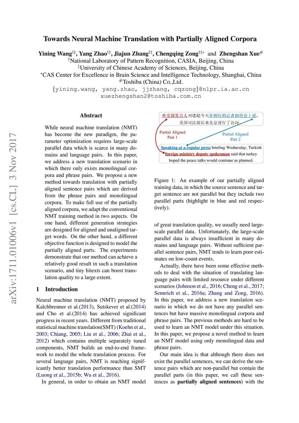 Towards Neural Machine Translation with Partially Aligned Corpora