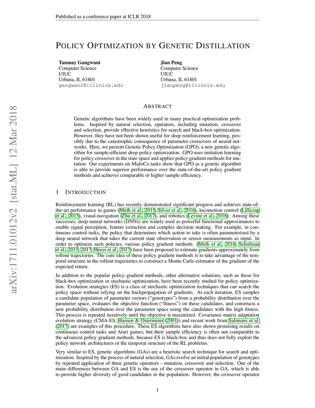 Genetic algorithms have been widely used in many practical optimization problems. Inspired by natural selection, operators, including mutation, crossover and selection, provide effective heuristics for search and black-box optimization. However, they have not been shown useful for deep reinforcement learning, possibly due to the catastrophic consequence of parameter crossovers of neural networks. Here, we present Genetic Policy Optimization (GPO), a new genetic algorithm for sample-efficient deep policy optimization. GPO uses imitation learning for policy crossover in the state space and applies policy gradient methods for mutation. Our experiments on MuJoCo tasks show that GPO as a genetic algorithm is able to provide superior performance over the state-of-the-art policy gradient methods and achieves comparable or higher sample efficiency.