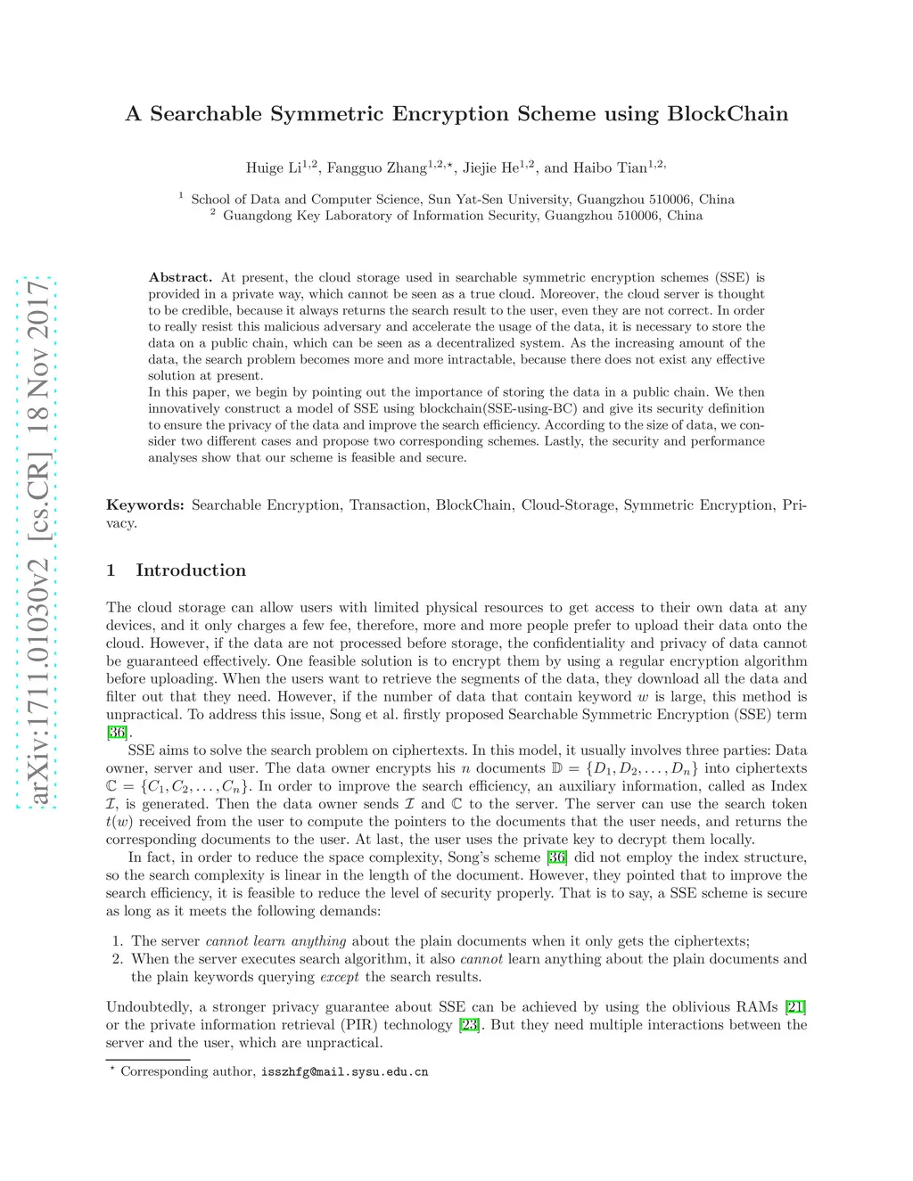 A Searchable Symmetric Encryption Scheme using BlockChain