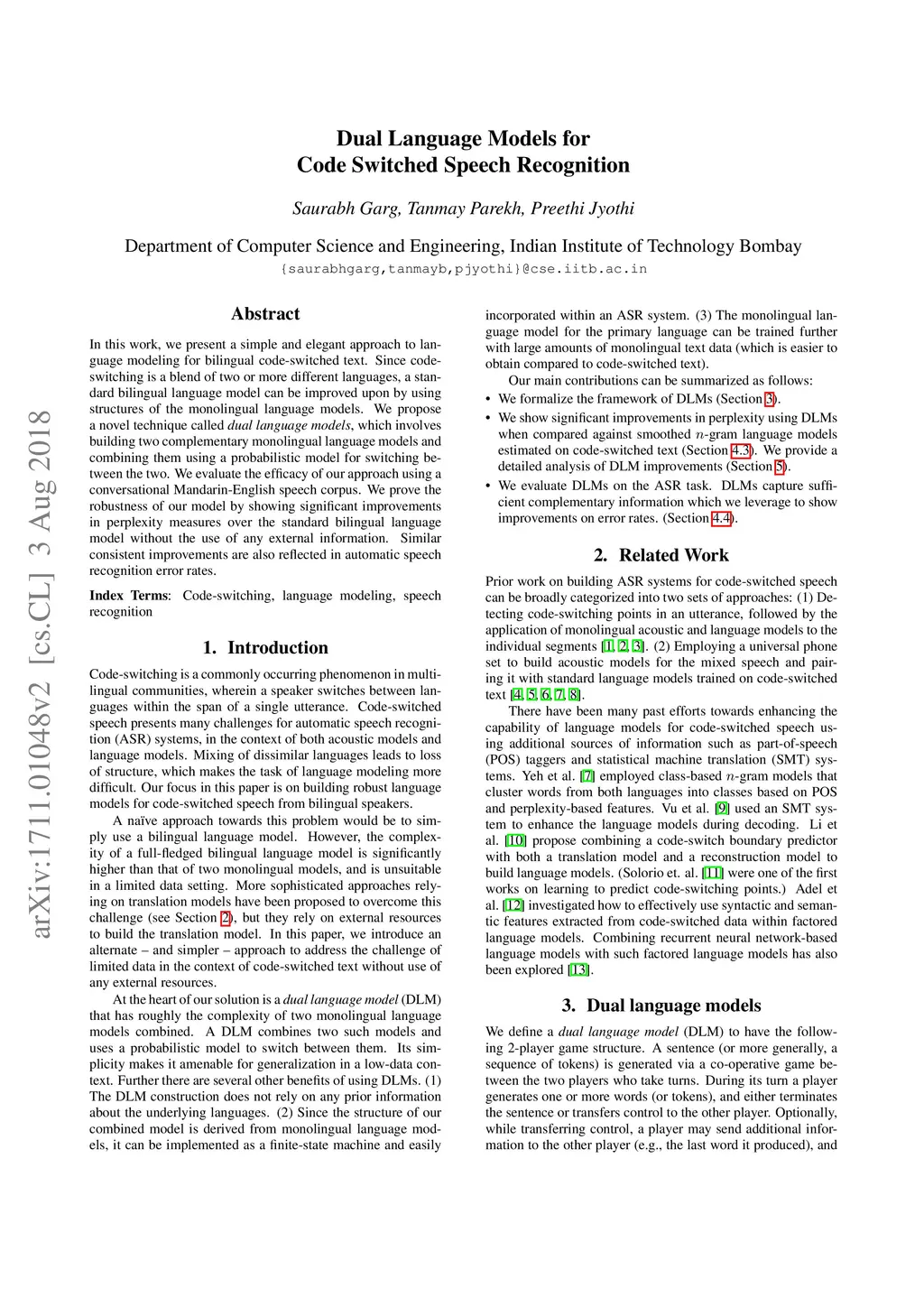 Dual Language Models for Code Switched Speech Recognition