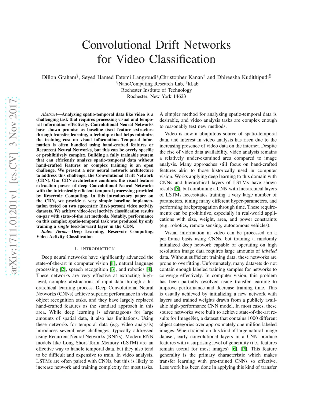 Analyzing spatio-temporal data like video is a challenging task that requires processing visual and temporal information effectively. Convolutional Neural Networks have shown promise as baseline fixed feature extractors through transfer learning, a technique that helps minimize the training cost on visual information. Temporal information is often handled using hand-crafted features or Recurrent Neural Networks, but this can be overly specific or prohibitively complex. Building a fully trainable system that can efficiently analyze spatio-temporal data without hand-crafted features or complex training is an open challenge. We present a new neural network architecture to address this challenge, the Convolutional Drift Network (CDN). Our CDN architecture combines the visual feature extraction power of deep Convolutional Neural Networks with the intrinsically efficient temporal processing provided by Reservoir Computing. In this introductory paper on the CDN, we provide a very simple baseline implementation tested on two egocentric (first-person) video activity datasets.We achieve video-level activity classification results on-par with state-of-the art methods. Notably, performance on this complex spatio-temporal task was produced by only training a single feed-forward layer in the CDN.