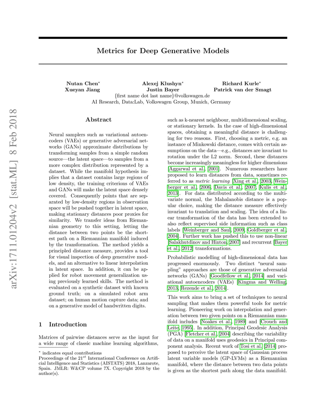 Neural samplers such as variational autoencoders (VAEs) or generative adversarial networks (GANs) approximate distributions by transforming samples from a simple random source---the latent space---to samples from a more complex distribution represented by a dataset. While the manifold hypothesis implies that the density induced by a dataset contains large regions of low density, the training criterions of VAEs and GANs will make the latent space densely covered. Consequently points that are separated by low-density regions in observation space will be pushed together in latent space, making stationary distances poor proxies for similarity. We transfer ideas from Riemannian geometry to this setting, letting the distance between two points be the shortest path on a Riemannian manifold induced by the transformation. The method yields a principled distance measure, provides a tool for visual inspection of deep generative models, and an alternative to linear interpolation in latent space. In addition, it can be applied for robot movement generalization using previously learned skills. The method is evaluated on a synthetic dataset with known ground truth; on a simulated robot arm dataset; on human motion capture data; and on a generative model of handwritten digits.