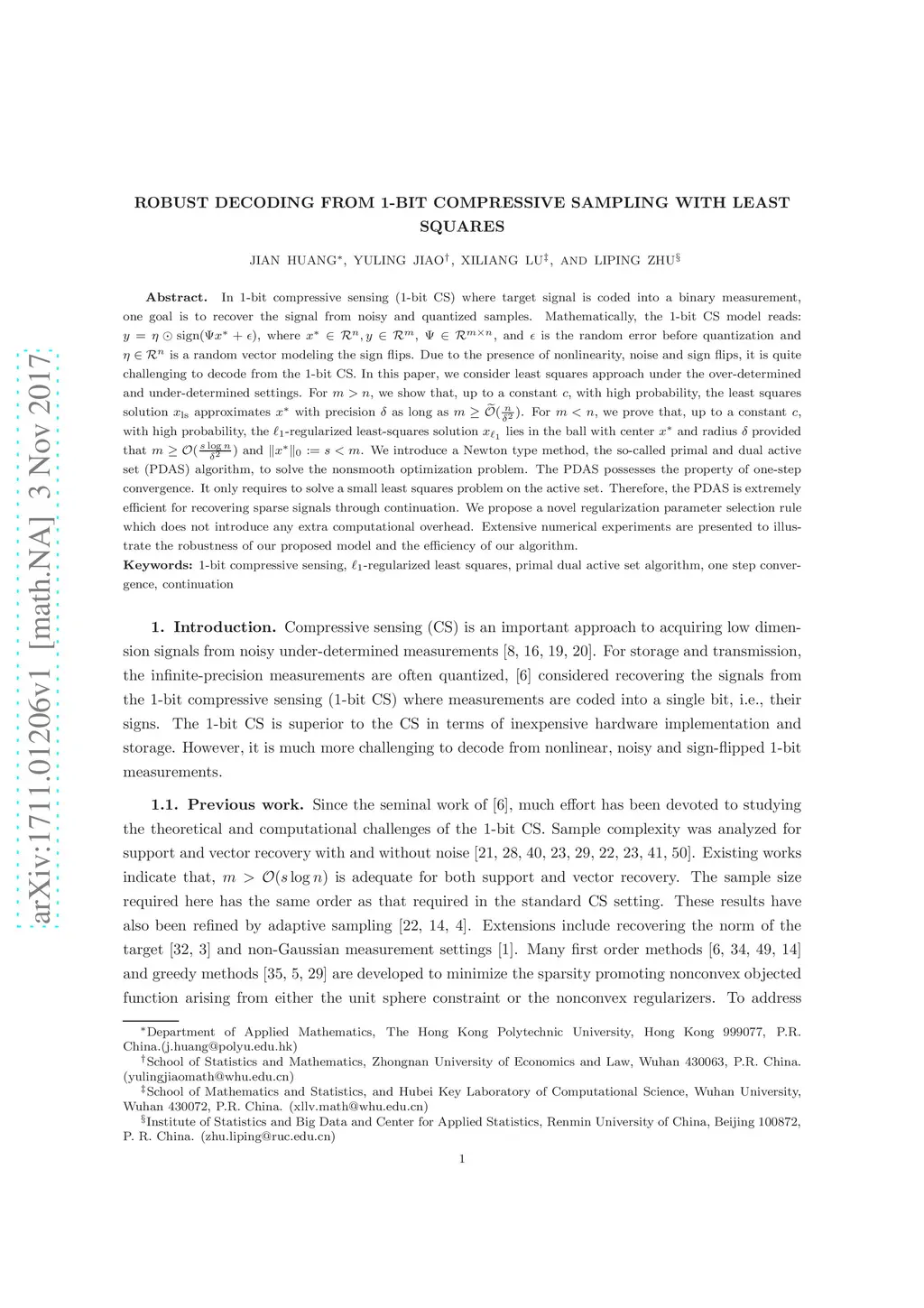 In 1-bit compressive sensing (1-bit CS) where target signal is coded into a binary measurement, one goal is to recover the signal from noisy and quantized samples. Mathematically, the 1-bit CS model reads: , where , , and is the random error before quantization and is a random vector modeling the sign flips. Due to the presence of nonlinearity, noise and sign flips, it is quite challenging to decode from the 1-bit CS. In this paper, we consider least squares approach under the over-determined and under-determined settings. For , we show that, up to a constant , with high probability, the least squares solution approximates $ x^*$ with precision as long as . For , we prove that, up to a constant , with high probability, the -regularized least-squares solution lies in the ball with center and radius provided that and . We introduce a Newton type method, the so-called primal and dual active set (PDAS) algorithm, to solve the nonsmooth optimization problem. The PDAS possesses the property of one-step convergence. It only requires to solve a small least squares problem on the active set. Therefore, the PDAS is extremely efficient for recovering sparse signals through continuation. We propose a novel regularization parameter selection rule which does not introduce any extra computational overhead. Extensive numerical experiments are presented to illustrate the robustness of our proposed model and the efficiency of our algorithm.