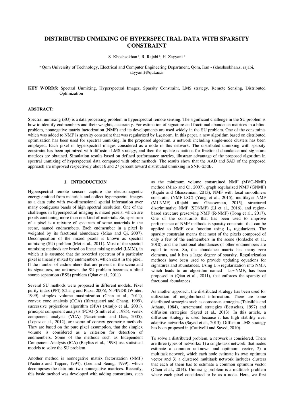 Spectral unmixing (SU) is a data processing problem in hyperspectral remote sensing. The significant challenge in the SU problem is how to identify endmembers and their weights, accurately. For estimation of signature and fractional abundance matrices in a blind problem, nonnegative matrix factorization (NMF) and its developments are used widely in the SU problem. One of the constraints which was added to NMF is sparsity constraint that was regularized by L 1/2 norm. In this paper, a new algorithm based on distributed optimization has been used for spectral unmixing. In the proposed algorithm, a network including single-node clusters has been employed. Each pixel in hyperspectral images considered as a node in this network. The distributed unmixing with sparsity constraint has been optimized with diffusion LMS strategy, and then the update equations for fractional abundance and signature matrices are obtained. Simulation results based on defined performance metrics, illustrate advantage of the proposed algorithm in spectral unmixing of hyperspectral data compared with other methods. The results show that the AAD and SAD of the proposed approach are improved respectively about 6 and 27 percent toward distributed unmixing in SNR=25dB.