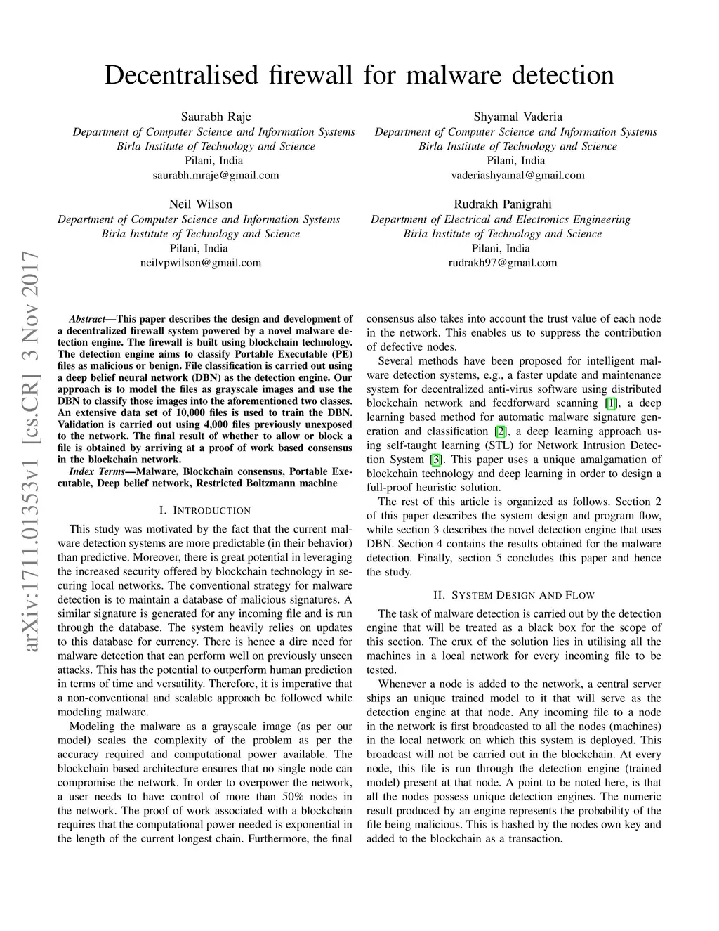 This paper describes the design and development of a decentralized firewall system powered by a novel malware detection engine. The firewall is built using blockchain technology. The detection engine aims to classify Portable Executable (PE) files as malicious or benign. File classification is carried out using a deep belief neural network (DBN) as the detection engine. Our approach is to model the files as grayscale images and use the DBN to classify those images into the aforementioned two classes. An extensive data set of 10,000 files is used to train the DBN. Validation is carried out using 4,000 files previously unexposed to the network. The final result of whether to allow or block a file is obtained by arriving at a proof of work based consensus in the blockchain network.