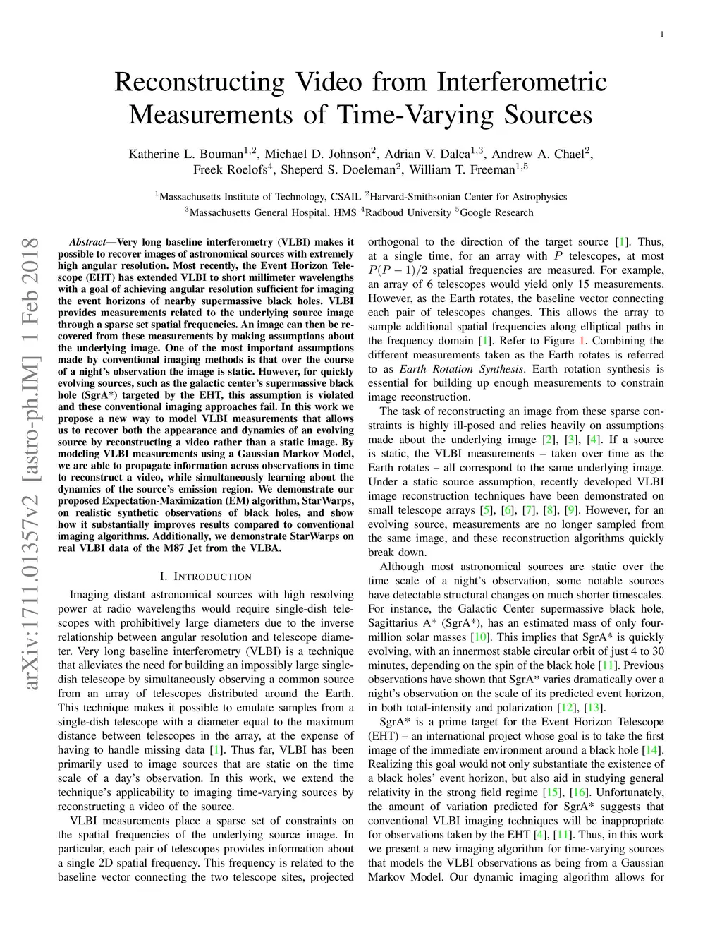Very long baseline interferometry (VLBI) makes it possible to recover images of astronomical sources with extremely high angular resolution. Most recently, the Event Horizon Telescope (EHT) has extended VLBI to short millimeter wavelengths with a goal of achieving angular resolution sufficient for imaging the event horizons of nearby supermassive black holes. VLBI provides measurements related to the underlying source image through a sparse set spatial frequencies. An image can then be recovered from these measurements by making assumptions about the underlying image. One of the most important assumptions made by conventional imaging methods is that over the course of a night's observation the image is static. However, for quickly evolving sources, such as the galactic center's supermassive black hole (Sgr A*) targeted by the EHT, this assumption is violated and these conventional imaging approaches fail. In this work we propose a new way to model VLBI measurements that allows us to recover both the appearance and dynamics of an evolving source by reconstructing a video rather than a static image. By modeling VLBI measurements using a Gaussian Markov Model, we are able to propagate information across observations in time to reconstruct a video, while simultaneously learning about the dynamics of the source's emission region. We demonstrate our proposed Expectation-Maximization (EM) algorithm, StarWarps, on realistic synthetic observations of black holes, and show how it substantially improves results compared to conventional imaging algorithms. Additionally, we demonstrate StarWarps on real VLBI data of the M87 Jet from the VLBA.