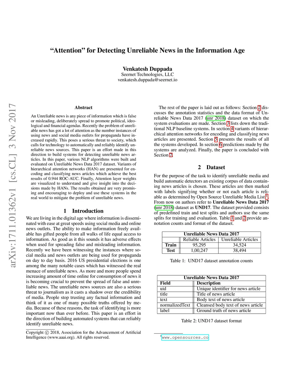 An Unreliable news is any piece of information which is false or misleading, deliberately spread to promote political, ideological and financial agendas. Recently the problem of unreliable news has got a lot of attention as the number instances of using news and social media outlets for propaganda have increased rapidly. This poses a serious threat to society, which calls for technology to automatically and reliably identify unreliable news sources. This paper is an effort made in this direction to build systems for detecting unreliable news articles. In this paper, various NLP algorithms were built and evaluated on Unreliable News Data 2017 dataset. Variants of hierarchical attention networks (HAN) are presented for encoding and classifying news articles which achieve the best results of 0.944 ROC-AUC. Finally, Attention layer weights are visualized to understand and give insight into the decisions made by HANs. The results obtained are very promising and encouraging to deploy and use these systems in the real world to mitigate the problem of unreliable news.