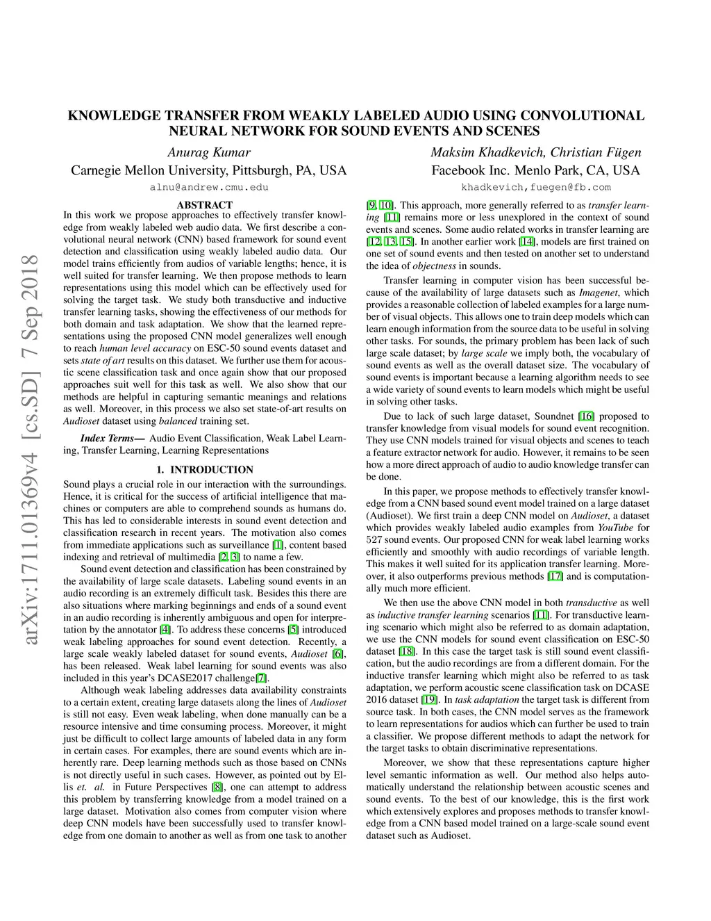 In this work we propose approaches to effectively transfer knowledge from weakly labeled web audio data. We first describe a convolutional neural network (CNN) based framework for sound event detection and classification using weakly labeled audio data. Our model trains efficiently from audios of variable lengths; hence, it is well suited for transfer learning. We then propose methods to learn representations using this model which can be effectively used for solving the target task. We study both transductive and inductive transfer learning tasks, showing the effectiveness of our methods for both domain and task adaptation. We show that the learned representations using the proposed CNN model generalizes well enough to reach human level accuracy on ESC-50 sound events dataset and set state of art results on this dataset. We further use them for acoustic scene classification task and once again show that our proposed approaches suit well for this task as well. We also show that our methods are helpful in capturing semantic meanings and relations as well. Moreover, in this process we also set state-of-art results on Audioset dataset, relying on balanced training set.