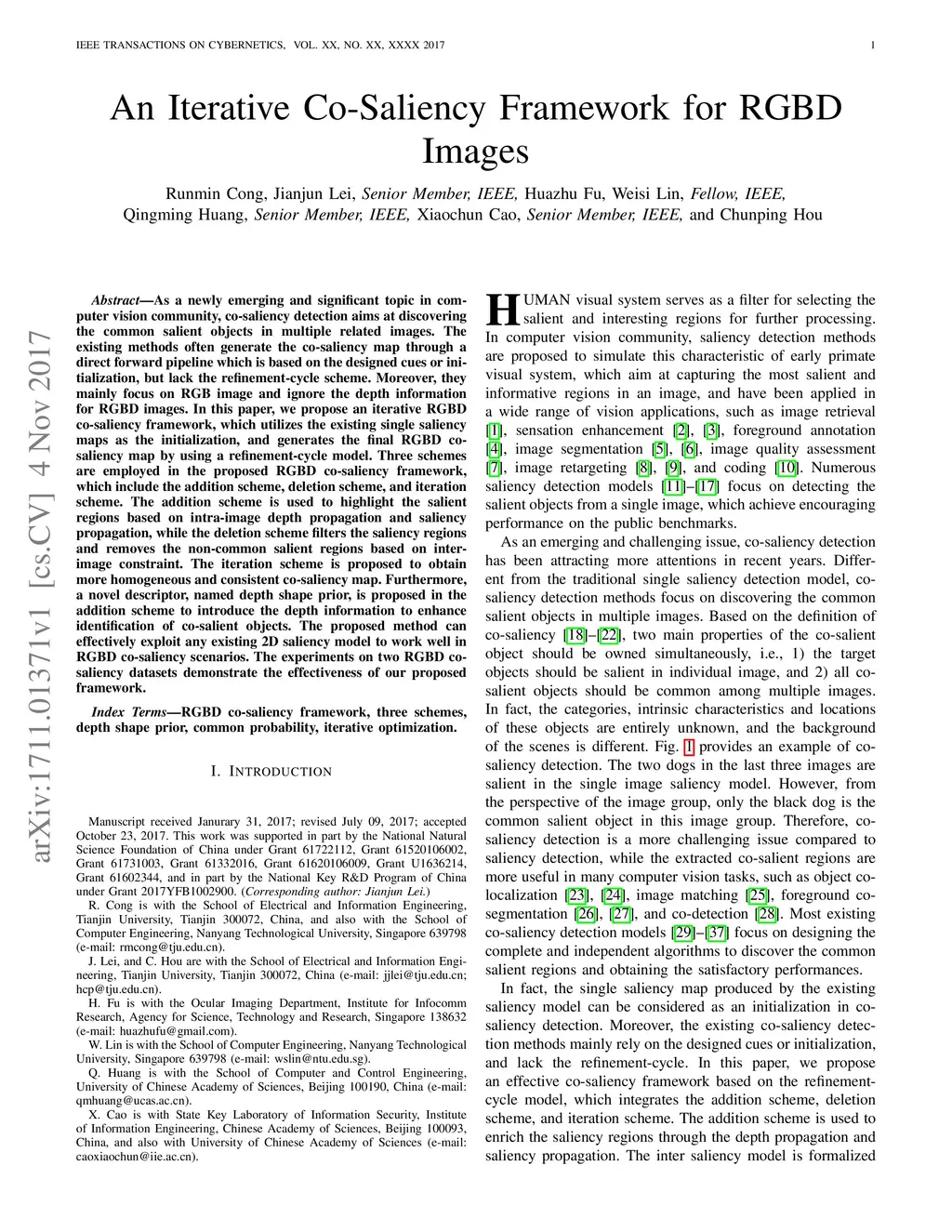 As a newly emerging and significant topic in computer vision community, co-saliency detection aims at discovering the common salient objects in multiple related images. The existing methods often generate the co-saliency map through a direct forward pipeline which is based on the designed cues or initialization, but lack the refinement-cycle scheme. Moreover, they mainly focus on RGB image and ignore the depth information for RGBD images. In this paper, we propose an iterative RGBD co-saliency framework, which utilizes the existing single saliency maps as the initialization, and generates the final RGBD cosaliency map by using a refinement-cycle model. Three schemes are employed in the proposed RGBD co-saliency framework, which include the addition scheme, deletion scheme, and iteration scheme. The addition scheme is used to highlight the salient regions based on intra-image depth propagation and saliency propagation, while the deletion scheme filters the saliency regions and removes the non-common salient regions based on interimage constraint. The iteration scheme is proposed to obtain more homogeneous and consistent co-saliency map. Furthermore, a novel descriptor, named depth shape prior, is proposed in the addition scheme to introduce the depth information to enhance identification of co-salient objects. The proposed method can effectively exploit any existing 2D saliency model to work well in RGBD co-saliency scenarios. The experiments on two RGBD cosaliency datasets demonstrate the effectiveness of our proposed framework.