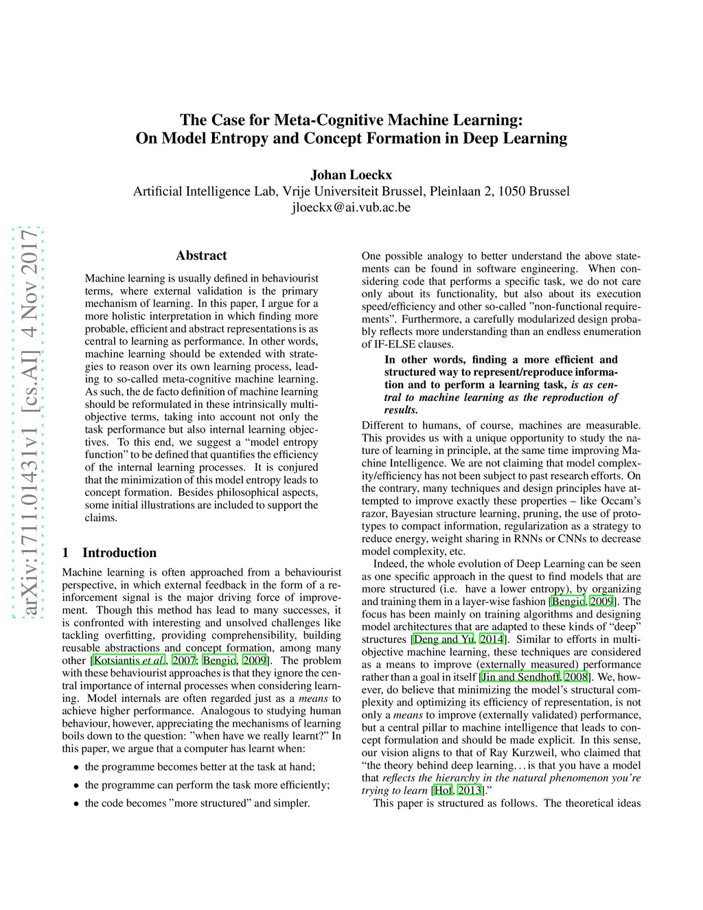 Machine learning is usually defined in behaviourist terms, where external validation is the primary mechanism of learning. In this paper, I argue for a more holistic interpretation in which finding more probable, efficient and abstract representations is as central to learning as performance. In other words, machine learning should be extended with strategies to reason over its own learning process, leading to so-called meta-cognitive machine learning. As such, the de facto definition of machine learning should be reformulated in these intrinsically multi-objective terms, taking into account not only the task performance but also internal learning objectives. To this end, we suggest a "model entropy function" to be defined that quantifies the efficiency of the internal learning processes. It is conjured that the minimization of this model entropy leads to concept formation. Besides philosophical aspects, some initial illustrations are included to support the claims.