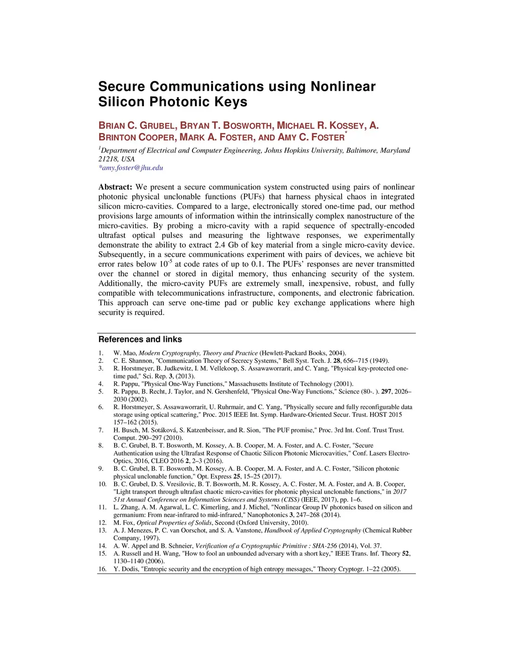 Secure Communications using Nonlinear Silicon Photonic Keys