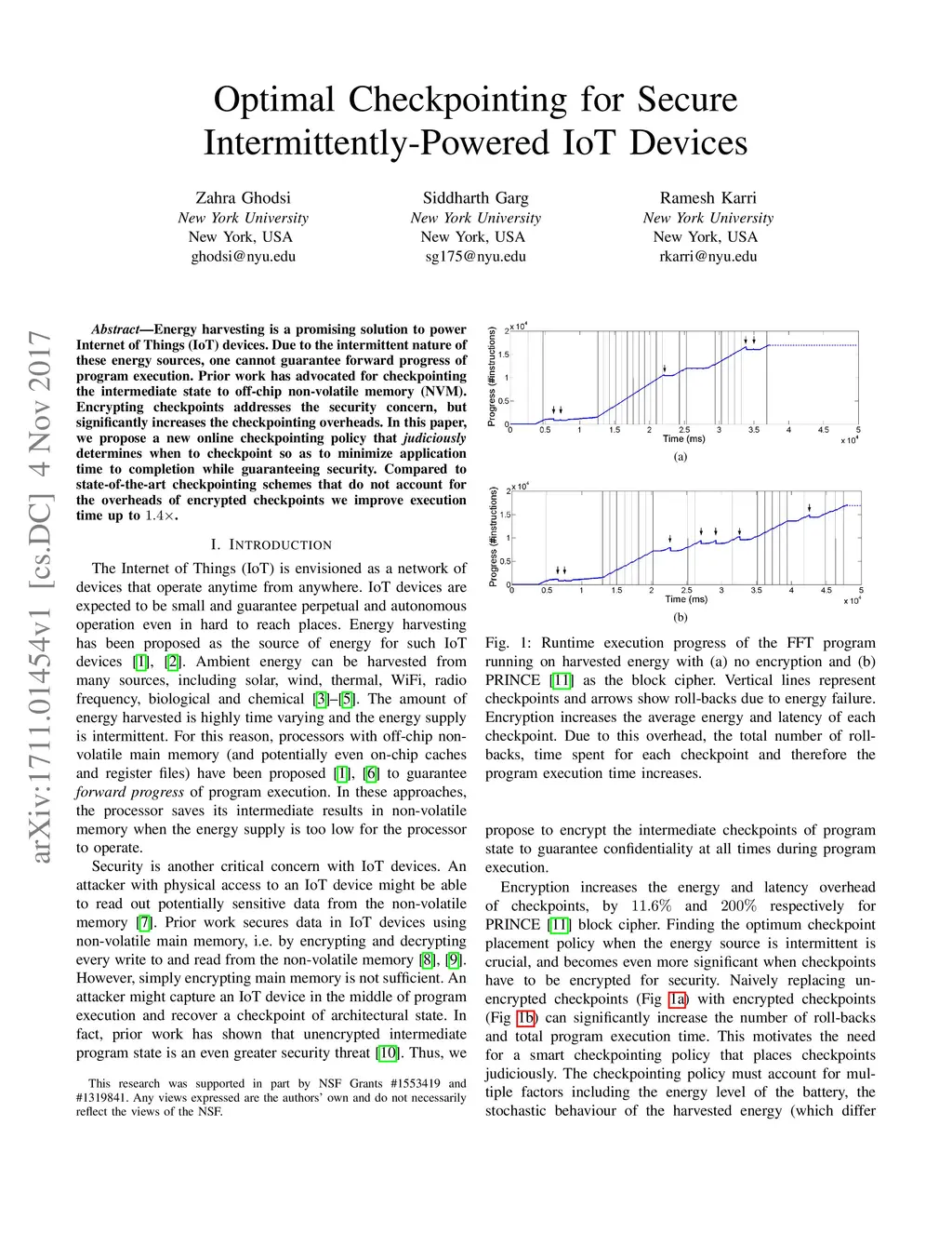 Energy harvesting is a promising solution to power Internet of Things (IoT) devices. Due to the intermittent nature of these energy sources, one cannot guarantee forward progress of program execution. Prior work has advocated for checkpointing the intermediate state to off-chip non-volatile memory (NVM). Encrypting checkpoints addresses the security concern, but significantly increases the checkpointing overheads. In this paper, we propose a new online checkpointing policy that judiciously determines when to checkpoint so as to minimize application time to completion while guaranteeing security. Compared to state-of-the-art checkpointing schemes that do not account for the overheads of encrypted checkpoints we improve execution time up to 1.4x.