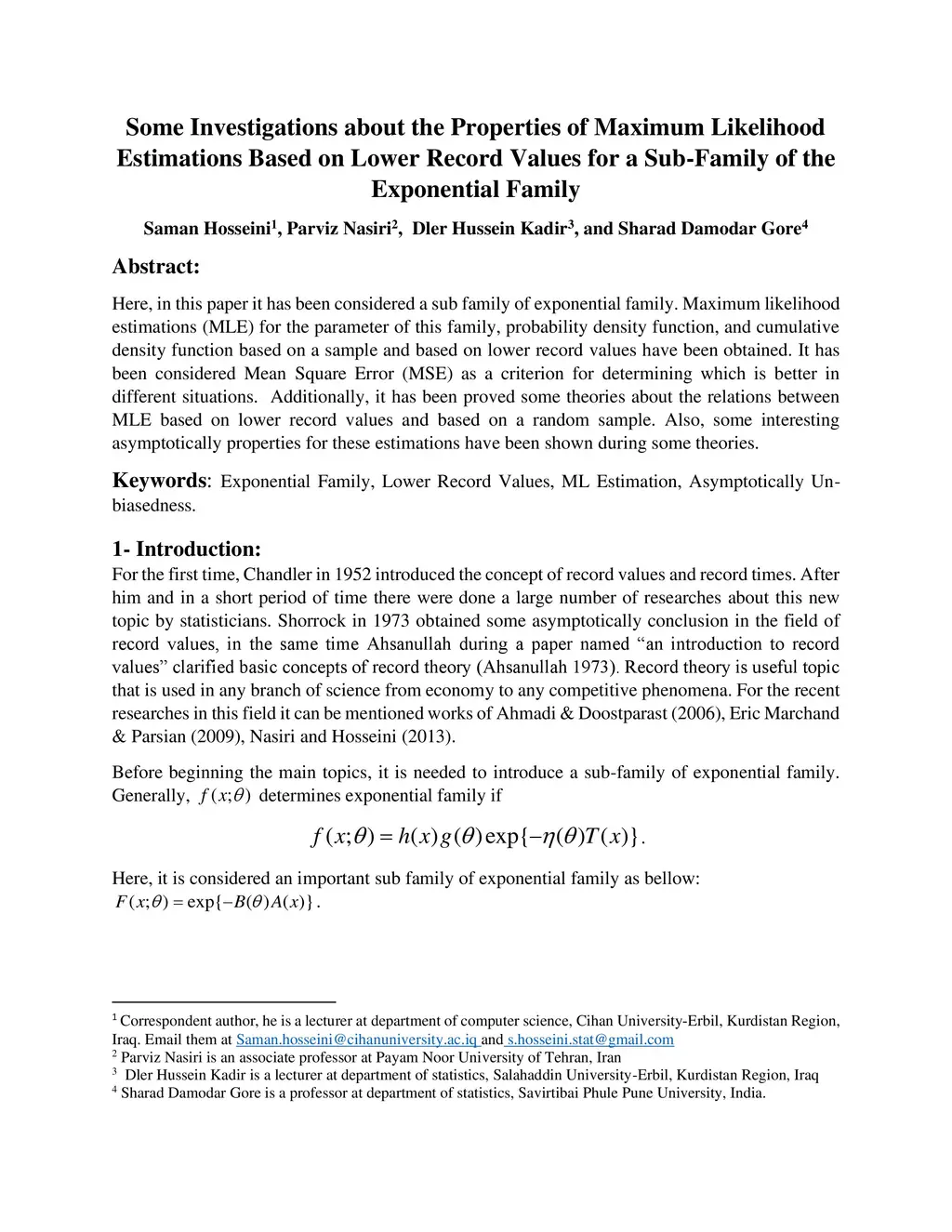Here, in this paper it has been considered a sub family of exponential family. Maximum likelihood estimations (MLE) for the parameter of this family, probability density function, and cumulative density function based on a sample and based on lower record values have been obtained. It has been considered Mean Square Error (MSE) as a criterion for determining which is better in different situations. Additionally, it has been proved some theories about the relations between MLE based on lower record values and based on a random sample. Also, some interesting asymptotically properties for these estimations have been shown during some theories.