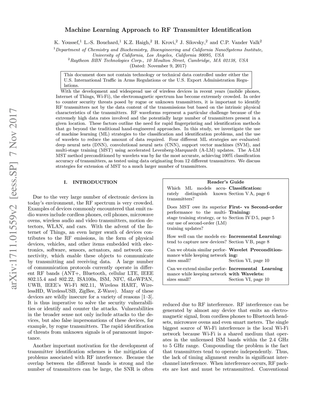 With the development and widespread use of wireless devices in recent years (mobile phones, Internet of Things, Wi-Fi), the electromagnetic spectrum has become extremely crowded. In order to counter security threats posed by rogue or unknown transmitters, it is important to identify RF transmitters not by the data content of the transmissions but based on the intrinsic physical characteristics of the transmitters. RF waveforms represent a particular challenge because of the extremely high data rates involved and the potentially large number of transmitters present in a given location. These factors outline the need for rapid fingerprinting and identification methods that go beyond the traditional hand-engineered approaches. In this study, we investigate the use of machine learning (ML) strategies to the classification and identification problems, and the use of wavelets to reduce the amount of data required. Four different ML strategies are evaluated: deep neural nets (DNN), convolutional neural nets (CNN), support vector machines (SVM), and multi-stage training (MST) using accelerated Levenberg-Marquardt (A-LM) updates. The A-LM MST method preconditioned by wavelets was by far the most accurate, achieving 100% classification accuracy of transmitters, as tested using data originating from 12 different transmitters. We discuss strategies for extension of MST to a much larger number of transmitters.