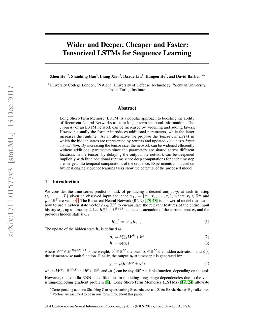 Long Short-Term Memory (LSTM) is a popular approach to boosting the ability of Recurrent Neural Networks to store longer term temporal information. The capacity of an LSTM network can be increased by widening and adding layers. However, usually the former introduces additional parameters, while the latter increases the runtime. As an alternative we propose the Tensorized LSTM in which the hidden states are represented by tensors and updated via a cross-layer convolution. By increasing the tensor size, the network can be widened efficiently without additional parameters since the parameters are shared across different locations in the tensor; by delaying the output, the network can be deepened implicitly with little additional runtime since deep computations for each timestep are merged into temporal computations of the sequence. Experiments conducted on five challenging sequence learning tasks show the potential of the proposed model.