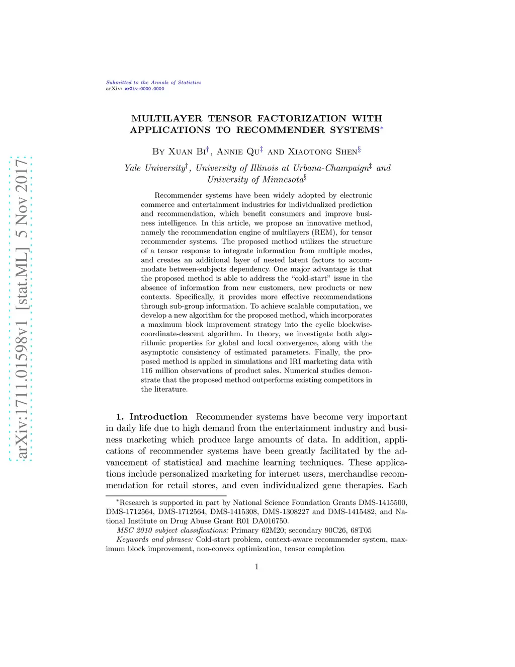 Recommender systems have been widely adopted by electronic commerce and entertainment industries for individualized prediction and recommendation, which benefit consumers and improve business intelligence. In this article, we propose an innovative method, namely the recommendation engine of multilayers (REM), for tensor recommender systems. The proposed method utilizes the structure of a tensor response to integrate information from multiple modes, and creates an additional layer of nested latent factors to accommodate between-subjects dependency. One major advantage is that the proposed method is able to address the "cold-start" issue in the absence of information from new customers, new products or new contexts. Specifically, it provides more effective recommendations through sub-group information. To achieve scalable computation, we develop a new algorithm for the proposed method, which incorporates a maximum block improvement strategy into the cyclic blockwise-coordinate-descent algorithm. In theory, we investigate both algorithmic properties for global and local convergence, along with the asymptotic consistency of estimated parameters. Finally, the proposed method is applied in simulations and IRI marketing data with 116 million observations of product sales. Numerical studies demonstrate that the proposed method outperforms existing competitors in the literature.