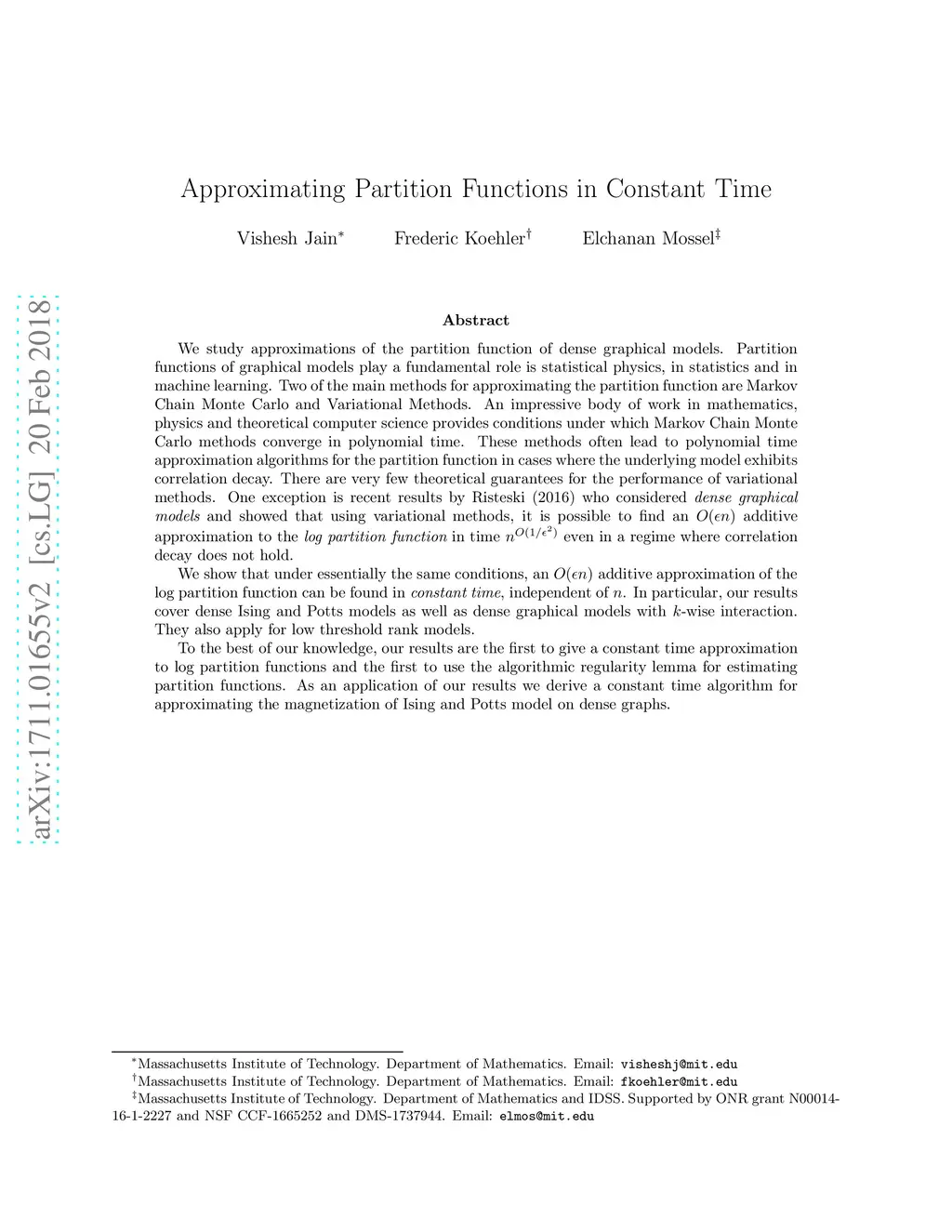 We study approximations of the partition function of dense graphical models. Partition functions of graphical models play a fundamental role is statistical physics, in statistics and in machine learning. Two of the main methods for approximating the partition function are Markov Chain Monte Carlo and Variational Methods. An impressive body of work in mathematics, physics and theoretical computer science provides conditions under which Markov Chain Monte Carlo methods converge in polynomial time. These methods often lead to polynomial time approximation algorithms for the partition function in cases where the underlying model exhibits correlation decay. There are very few theoretical guarantees for the performance of variational methods. One exception is recent results by Risteski (2016) who considered dense graphical models and showed that using variational methods, it is possible to find an additive approximation to the log partition function in time even in a regime where correlation decay does not hold. We show that under essentially the same conditions, an additive approximation of the log partition function can be found in constant time, independent of . In particular, our results cover dense Ising and Potts models as well as dense graphical models with -wise interaction. They also apply for low threshold rank models.