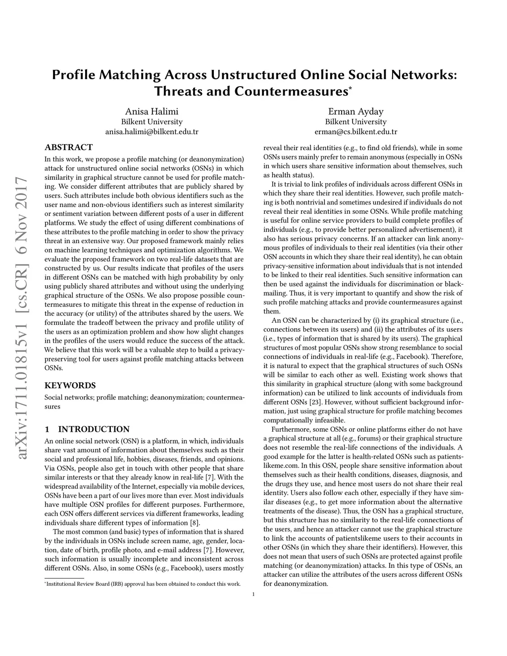 In this work, we propose a profile matching (or deanonymization) attack for unstructured online social networks (OSNs) in which similarity in graphical structure cannot be used for profile matching. We consider different attributes that are publicly shared by users. Such attributes include both obvious identifiers such as the user name and non-obvious identifiers such as interest similarity or sentiment variation between different posts of a user in different platforms. We study the effect of using different combinations of these attributes to the profile matching in order to show the privacy threat in an extensive way. Our proposed framework mainly relies on machine learning techniques and optimization algorithms. We evaluate the proposed framework on two real-life datasets that are constructed by us. Our results indicate that profiles of the users in different OSNs can be matched with high probability by only using publicly shared attributes and without using the underlying graphical structure of the OSNs. We also propose possible countermeasures to mitigate this threat in the expense of reduction in the accuracy (or utility) of the attributes shared by the users. We formulate the tradeoff between the privacy and profile utility of the users as an optimization problem and show how slight changes in the profiles of the users would reduce the success of the attack. We believe that this work will be a valuable step to build a privacy-preserving tool for users against profile matching attacks between OSNs.