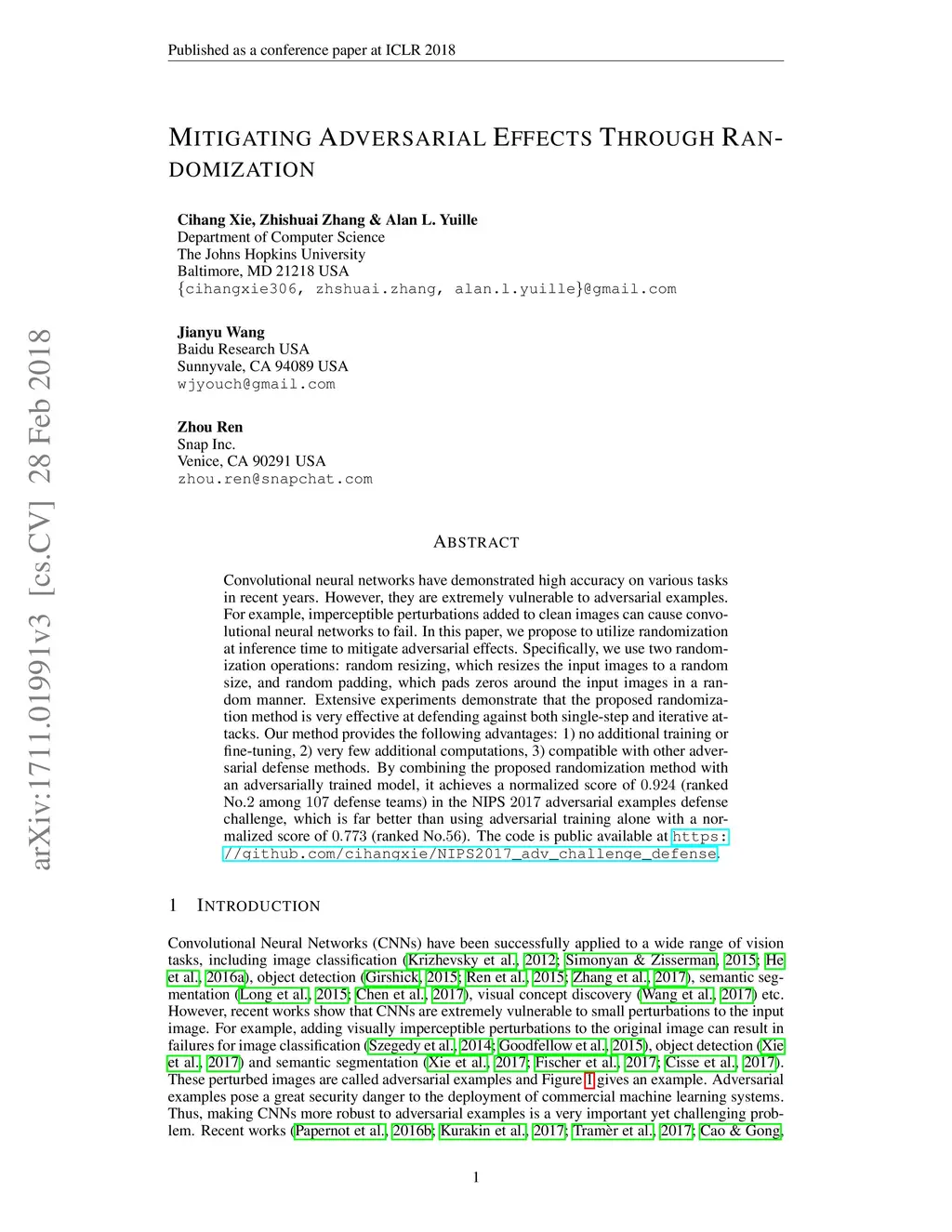 Mitigating Adversarial Effects Through Randomization
