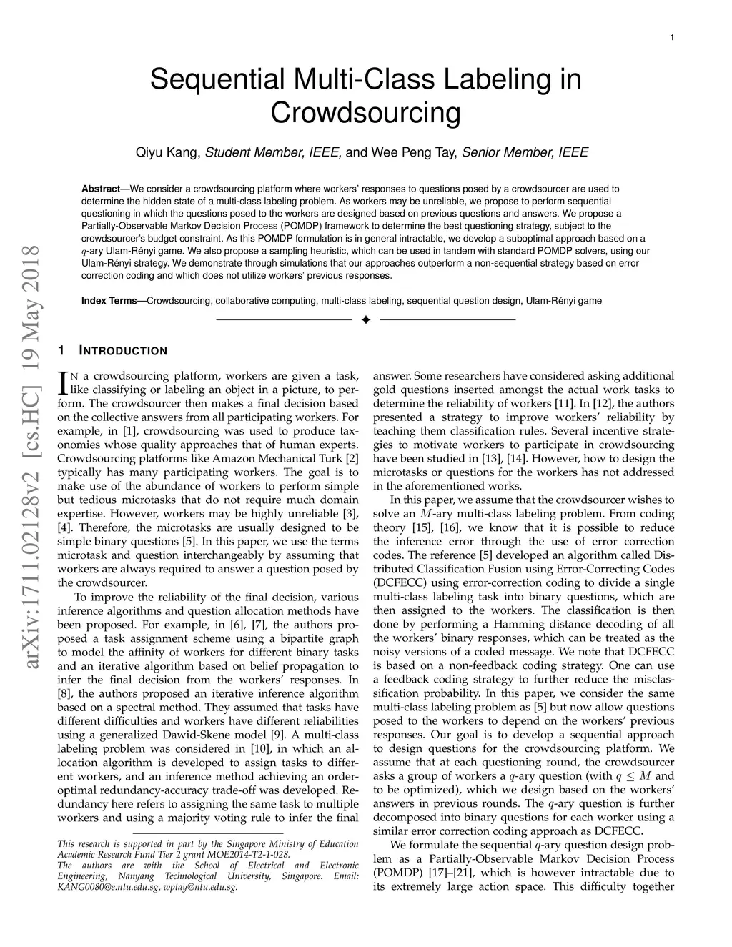 We consider a crowdsourcing platform where workers' responses to questions posed by a crowdsourcer are used to determine the hidden state of a multi-class labeling problem. As workers may be unreliable, we propose to perform sequential questioning in which the questions posed to the workers are designed based on previous questions and answers. We propose a Partially-Observable Markov Decision Process (POMDP) framework to determine the best questioning strategy, subject to the crowdsourcer's budget constraint. As this POMDP formulation is in general intractable, we develop a suboptimal approach based on a -ary Ulam-R\ényi game. We also propose a sampling heuristic, which can be used in tandem with standard POMDP solvers, using our Ulam-R\ényi strategy. We demonstrate through simulations that our approaches outperform a non-sequential strategy based on error correction coding and which does not utilize workers' previous responses.
