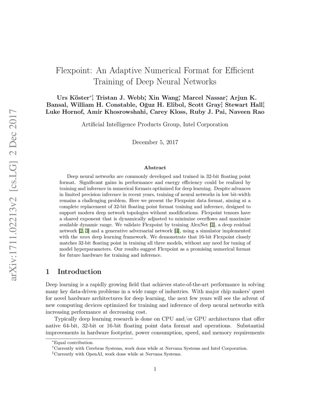 Flexpoint: An Adaptive Numerical Format for Efficient Training of Deep