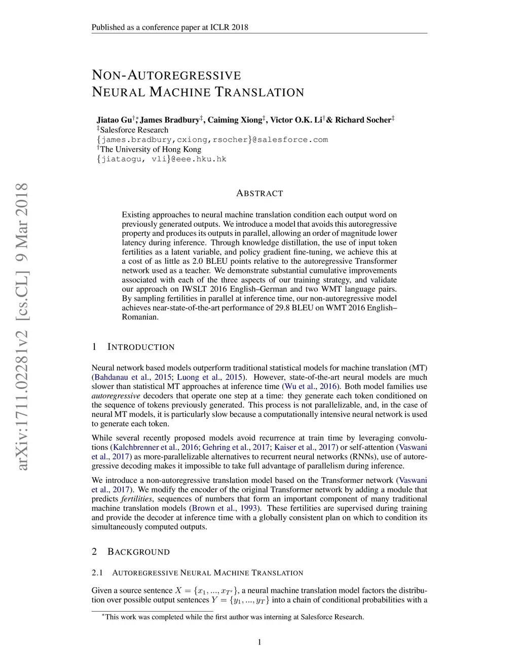 Non-Autoregressive Neural Machine Translation