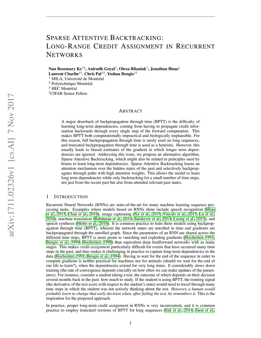 Sparse Attentive Backtracking: Long-Range Credit Assignment in Recurrent