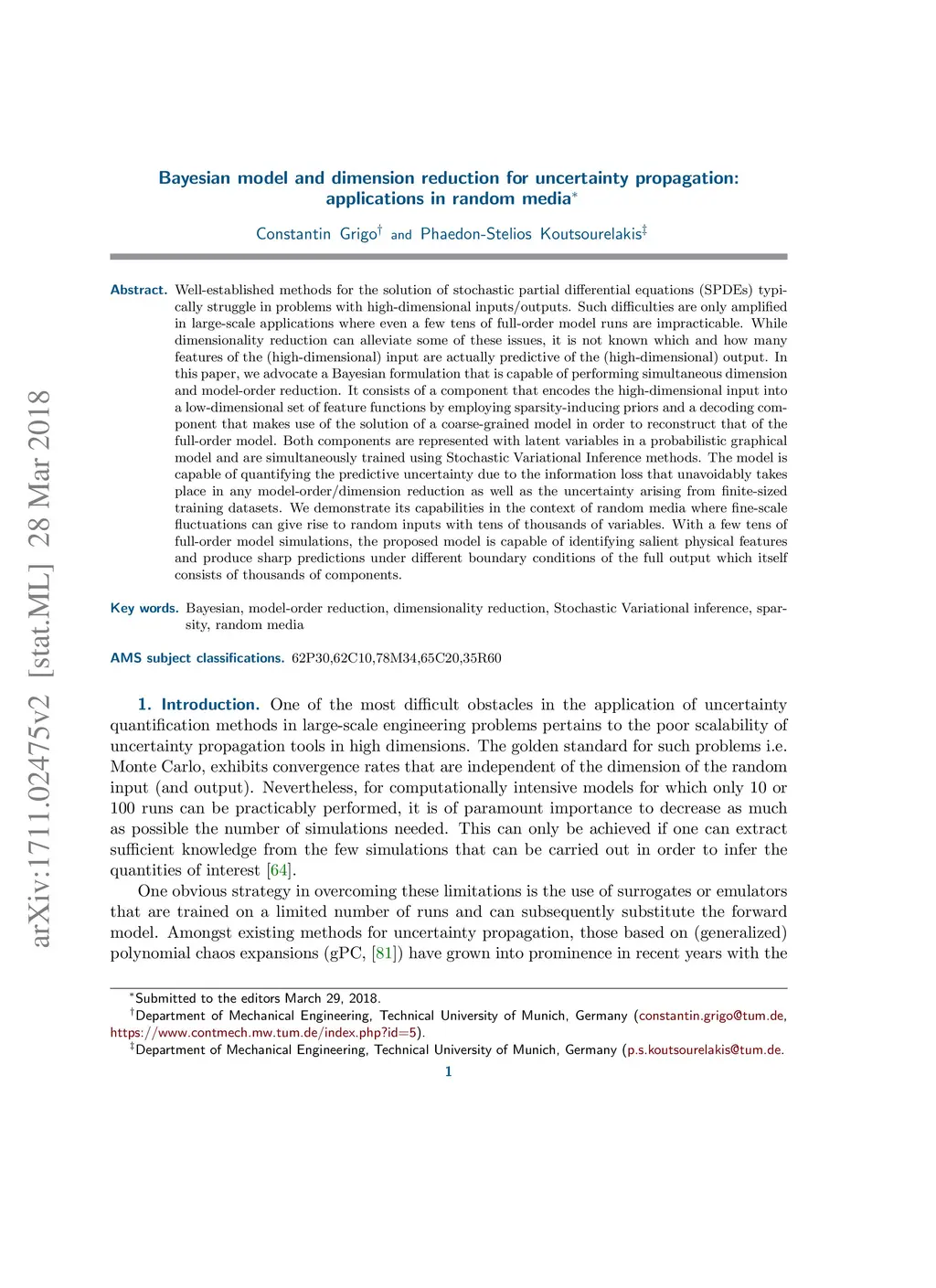 Well-established methods for the solution of stochastic partial differential equations (SPDEs) typically struggle in problems with high-dimensional inputs/outputs. Such difficulties are only amplified in large-scale applications where even a few tens of full-order model runs are impracticable. While dimensionality reduction can alleviate some of these issues, it is not known which and how many features of the (high-dimensional) input are actually predictive of the (high-dimensional) output. In this paper, we advocate a Bayesian formulation that is capable of performing simultaneous dimension and model-order reduction. It consists of a component that encodes the high-dimensional input into a low-dimensional set of feature functions by employing sparsity-enforcing priors and a decoding component that makes use of the solution of a coarse-grained model in order to reconstruct that of the full-order model. Both components are represented with latent variables in a probabilistic graphical model and are simultaneously trained using Stochastic Variational Inference methods. The model is capable of quantifying the predictive uncertainty due to the information loss that unavoidably takes place in any model-order/dimension reduction as well as the uncertainty arising from finite-sized training datasets. We demonstrate its capabilities in the context of random media where fine-scale fluctuations can give rise to random inputs with tens of thousands of variables. With a few tens of full-order model simulations, the proposed model is capable of identifying salient physical features and produce sharp predictions under different boundary conditions of the full output which itself consists of thousands of components.