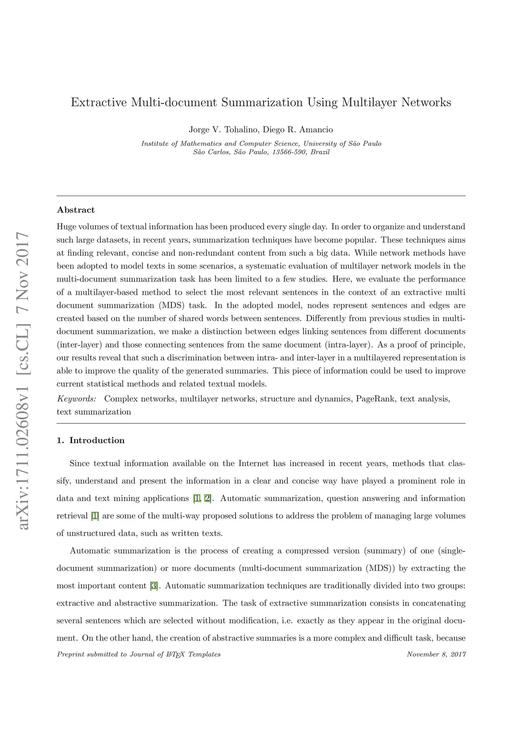 Extractive Multi-document Summarization Using Multilayer Networks