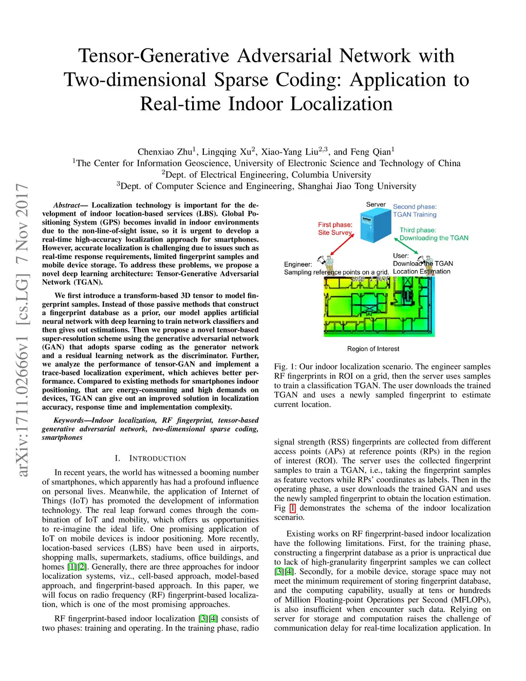Localization technology is important for the development of indoor location-based services (LBS). Global Positioning System (GPS) becomes invalid in indoor environments due to the non-line-of-sight issue, so it is urgent to develop a real-time high-accuracy localization approach for smartphones. However, accurate localization is challenging due to issues such as real-time response requirements, limited fingerprint samples and mobile device storage. To address these problems, we propose a novel deep learning architecture: Tensor-Generative Adversarial Network (TGAN). We first introduce a transform-based 3D tensor to model fingerprint samples. Instead of those passive methods that construct a fingerprint database as a prior, our model applies artificial neural network with deep learning to train network classifiers and then gives out estimations. Then we propose a novel tensor-based super-resolution scheme using the generative adversarial network (GAN) that adopts sparse coding as the generator network and a residual learning network as the discriminator. Further, we analyze the performance of tensor-GAN and implement a trace-based localization experiment, which achieves better performance. Compared to existing methods for smartphones indoor positioning, that are energy-consuming and high demands on devices, TGAN can give out an improved solution in localization accuracy, response time and implementation complexity.