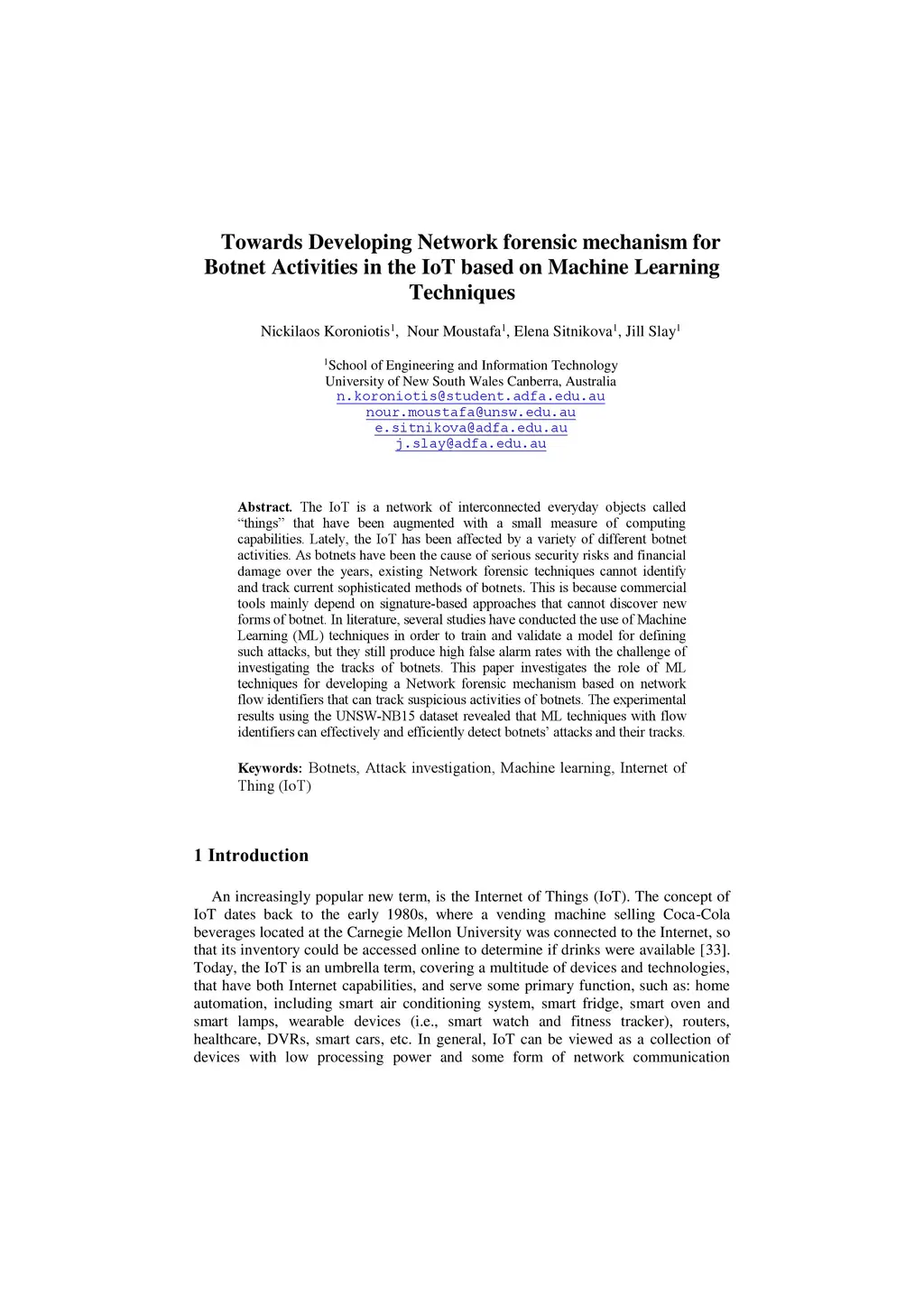 The IoT is a network of interconnected everyday objects called things that have been augmented with a small measure of computing capabilities. Lately, the IoT has been affected by a variety of different botnet activities. As botnets have been the cause of serious security risks and financial damage over the years, existing Network forensic techniques cannot identify and track current sophisticated methods of botnets. This is because commercial tools mainly depend on signature-based approaches that cannot discover new forms of botnet. In literature, several studies have conducted the use of Machine Learning ML techniques in order to train and validate a model for defining such attacks, but they still produce high false alarm rates with the challenge of investigating the tracks of botnets. This paper investigates the role of ML techniques for developing a Network forensic mechanism based on network flow identifiers that can track suspicious activities of botnets. The experimental results using the UNSW-NB15 dataset revealed that ML techniques with flow identifiers can effectively and efficiently detect botnets attacks and their tracks.
