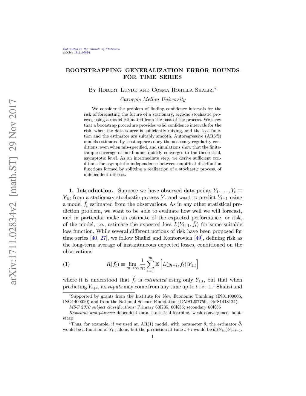 We consider the problem of finding confidence intervals for the risk of forecasting the future of a stationary, ergodic stochastic process, using a model estimated from the past of the process. We show that a bootstrap procedure provides valid confidence intervals for the risk, when the data source is sufficiently mixing, and the loss function and the estimator are suitably smooth. Autoregressive (AR(d)) models estimated by least squares obey the necessary regularity conditions, even when mis-specified, and simulations show that the finite- sample coverage of our bounds quickly converges to the theoretical, asymptotic level. As an intermediate step, we derive sufficient conditions for asymptotic independence between empirical distribution functions formed by splitting a realization of a stochastic process, of independent interest.