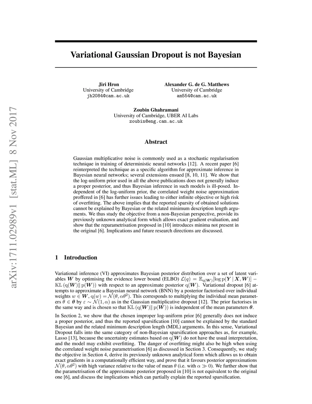 Gaussian multiplicative noise is commonly used as a stochastic regularisation technique in training of deterministic neural networks. A recent paper reinterpreted the technique as a specific algorithm for approximate inference in Bayesian neural networks; several extensions ensued. We show that the log-uniform prior used in all the above publications does not generally induce a proper posterior, and thus Bayesian inference in such models is ill-posed. Independent of the log-uniform prior, the correlated weight noise approximation has further issues leading to either infinite objective or high risk of overfitting. The above implies that the reported sparsity of obtained solutions cannot be explained by Bayesian or the related minimum description length arguments. We thus study the objective from a non-Bayesian perspective, provide its previously unknown analytical form which allows exact gradient evaluation, and show that the later proposed additive reparametrisation introduces minima not present in the original multiplicative parametrisation. Implications and future research directions are discussed.