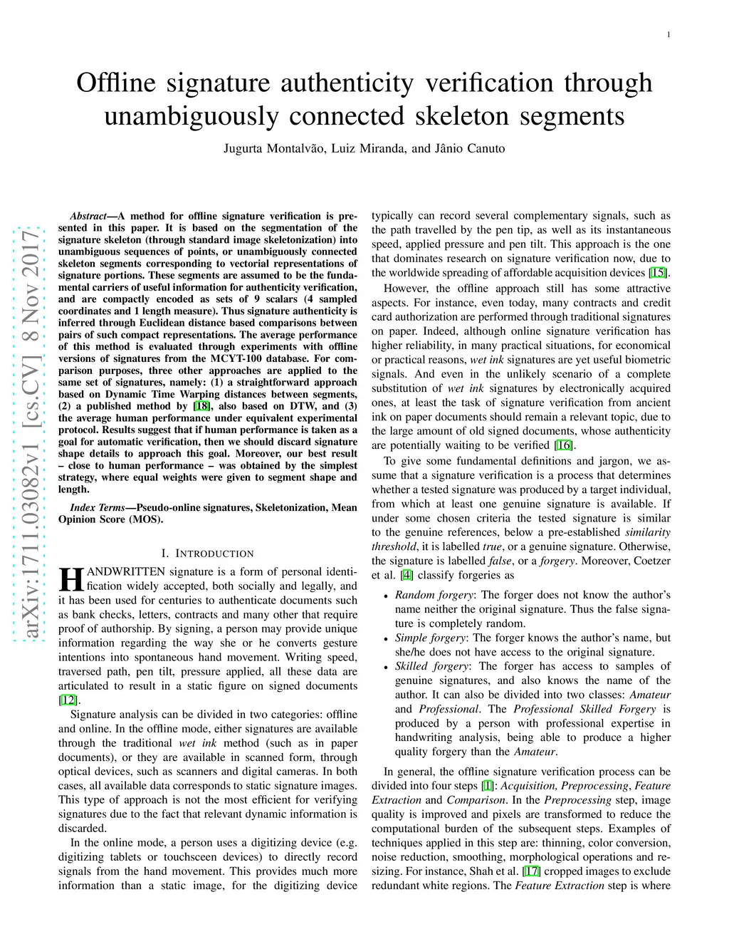 A method for offline signature verification is presented in this paper. It is based on the segmentation of the signature skeleton (through standard image skeletonization) into unambiguous sequences of points, or unambiguously connected skeleton segments corresponding to vectorial representations of signature portions. These segments are assumed to be the fundamental carriers of useful information for authenticity verification, and are compactly encoded as sets of 9 scalars (4 sampled coordinates and 1 length measure). Thus signature authenticity is inferred through Euclidean distance based comparisons between pairs of such compact representations. The average performance of this method is evaluated through experiments with offline versions of signatures from the MCYT-100 database. For comparison purposes, three other approaches are applied to the same set of signatures, namely: (1) a straightforward approach based on Dynamic Time Warping distances between segments, (2) a published method by [shanker2007], also based on DTW, and (3) the average human performance under equivalent experimental protocol. Results suggest that if human performance is taken as a goal for automatic verification, then we should discard signature shape details to approach this goal. Moreover, our best result -- close to human performance -- was obtained by the simplest strategy, where equal weights were given to segment shape and length.