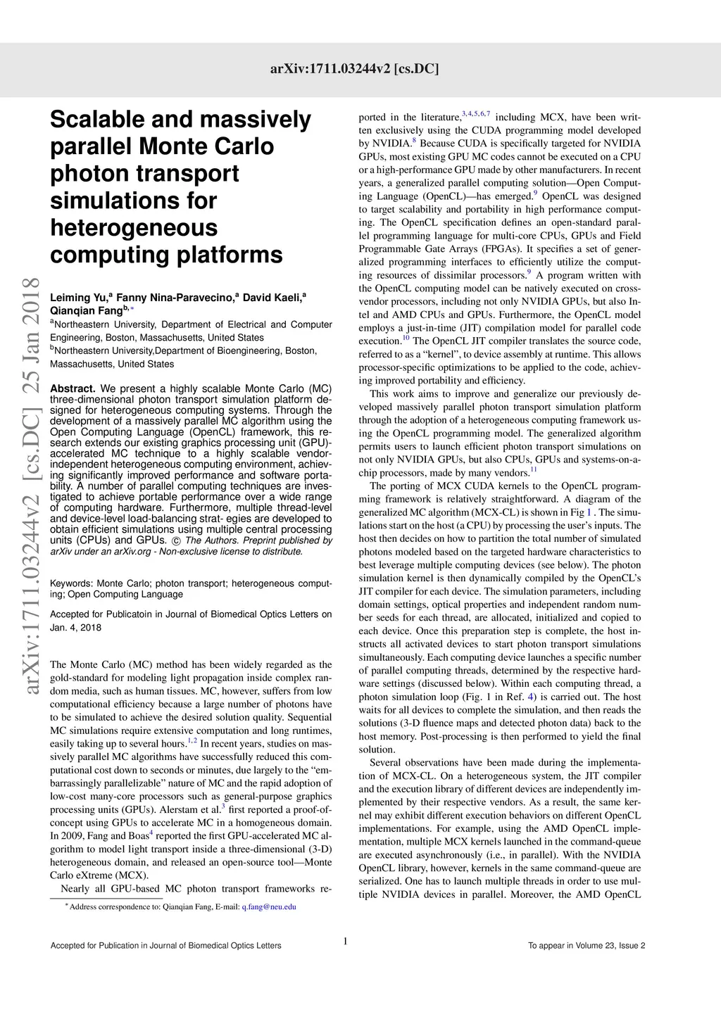We present a highly scalable Monte Carlo (MC) three-dimensional photon transport simulation platform designed for heterogeneous computing systems. Through the development of a massively parallel MC algorithm using the Open Computing Language (OpenCL) framework, this research extends our existing graphics processing unit (GPU)-accelerated MC technique to a highly scalable vendor-independent heterogeneous computing environment, achieving significantly improved performance and software portability. A number of parallel computing techniques are investigated to achieve portable performance over a wide range of computing hardware. Furthermore, multiple thread-level and device-level load-balancing strat- egies are developed to obtain efficient simulations using multiple central processing units (CPUs) and GPUs.
