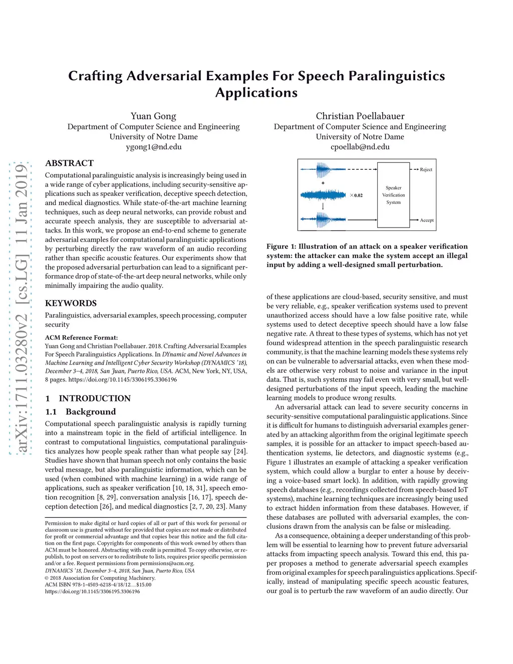 Crafting Adversarial Examples For Speech Paralinguistics Applications