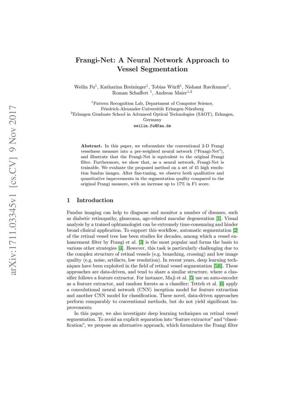 In this paper, we reformulate the conventional 2-D Frangi vesselness measure into a pre-weighted neural network ("Frangi-Net"), and illustrate that the Frangi-Net is equivalent to the original Frangi filter. Furthermore, we show that, as a neural network, Frangi-Net is trainable. We evaluate the proposed method on a set of 45 high resolution fundus images. After fine-tuning, we observe both qualitative and quantitative improvements in the segmentation quality compared to the original Frangi measure, with an increase up to in F1 score.